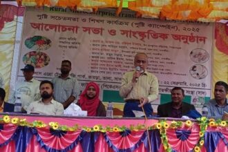 তালা প্রতিনিধি : সাতক্ষীরার তালায় পুষ্টি সচেতনতা ও শিখণ কার্যক্রম (পুষ্টি ক্যাম্পেইন) উপলক্ষ্যে র্যালী, আলোচনা সভা, নাটক, পটগান সাংস্কৃতিক অনুষ্ঠান অনুষ্ঠিত হয়েছে। শনিবার (২২ ফেব্রুয়ারী) সকালে তালার ভায়ড়ায় সাস এগ্রো টেকনোলজি পার্কে পল্লী কর্ম সহায়ক ফাউন্ডেশন (পিকেএসএফ) এর সহযোগীতায় সাতক্ষীরা উন্নয়ন সংস্থা (সাস) এই কর্মসূচী বাস্তবায়ন করে। অনুষ্ঠানে স্বাগত বক্তব্য রাখেন সাতক্ষীরা উন্নয়ন সংস্থা (সাস) এর নির্বাহী পরিচালক শেখ ইমান আলী। সাতক্ষীরা উন্নয়ন সংস্থা (সাস) এর সভাপতি আশুতোষ সরকারের সভাপতিত্বে ও প্রকল্প সমন্বয়ক খান মোঃ শাহ আলমের সঞ্চালনায় আলোচনা সভায় প্রধান অতিথি হিসেবে বক্তব্য রাখেন, পিকেএসএফ এর উপ-ব্যাপস্থাপনা পরিচালক ড. আকন্দ মোঃ রফিকুল ইসলাম। বিশেষ অতিথি হিসেবে বক্তব্য রাখেন, উপজেলা সিনিয়র মৎস্য কর্মকর্তা তারিক ইমাম, কৃষি সম্প্রসারণ কর্মকর্তা আফরোজা আক্তার রুমা, সেনেটারী ইন্সেপেক্টর খায়রুল আলম, পিকেএসএফ এর আরএমটিপি কর্মকর্তা ইব্রাহিম আলম ও উন্নয়ন প্রচেষ্টা’র নির্বাহী পরিচালক শেখ ইয়াকুব আলী। আলোচনা সভা শেষে পুষ্টি সচেতনতা ও শিখণ কার্যক্রম (পুষ্টি ক্যাম্পেইন) বিভিন্ন ধরণের স্টল অতিথি সহ সকলে পরিদর্শন করেন। দিবসটি উপলক্ষে দুপুরের পরে সচেতনতামূলক পটগাণ, নাটক ও রাতে সাংস্কৃতিক অনুষ্ঠানের আয়োজন করা হয়। এর আগে সকাল ১০ টায় বিভিন্ন শিক্ষা প্রতিষ্টানের শিক্ষার্থীদের নিয়ে র্যালী পুষ্টি সংক্রান্ত র্যালী বিভিন্ন সড়ক প্রদক্ষিণ করে।