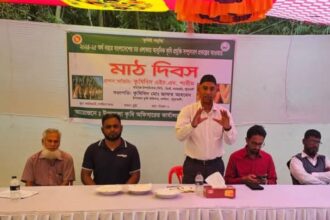 আহাম্মদ ইব্রাহিম অরবিল, দশমিনা(পটুয়াখালী) : পটুয়াখালীর দশমিনা উপজেলায় চরাঞ্চলে আধুনিক কৃষি প্রযুক্তি সম্প্রসারন প্রকল্পের আওতায় উপজেলা কৃষি সম্প্রসারন অধিদপ্তরের আয়োজনে জৈব বালাইনাশক পদ্ধতিতে চাষাবাদসহ তরমুজের উৎপাদন বৃদ্ধির লক্ষ্যে মাঠ দিবস অনুষ্ঠিত হয়। উপজেলার বাঁশবাড়িয়া ইউনিয়নের দক্ষিন দাসপাড়া গ্রামে এই মাঠ দিবস অনুষ্ঠিত হয়। উপজেলায় কৃষি উদ্যোক্তা তৈরি,পরিবেশ বান্ধব চাষ এবং কৃষকদেরকে উন্নত চাষ পদ্ধতির মাধ্যমে ফসলের উৎপাদন বাড়ানোর কৌশল ও প্রযুক্তি বিষয়ে মাঠ দিবসে অবহিত করা হয়। মাঠ দিবস অনুষ্ঠানে প্রধান অতিথি ছিলেন জেলা কৃষি সম্প্রসারন অধিদপ্তরের অতিরিক্ত উপপরিচালক (পিপি) এইচ.এম.শামীম। উপজেলা কৃষি কর্মকর্তা কৃষিবিদ মো. জাফর আহমেদ’র সভাপতিত্বে মাঠ দিবস অনুষ্ঠানে অন্যান্যদের মধ্যে উপস্থিত ছিলেন উপ-সহকারী কৃষি কর্মকর্তা আবু জাফর হাওলাদার, মো. নাসির উদ্দিন, স্থানীয় পর্যায়ের কৃষক, গনমাধ্যমকর্মী, সমাজসেবকসহ গন্যমান্য ব্যক্তিবর্গ। মাঠ দিবস অনুষ্ঠানে কৃষকদেরকে কৃষি বিষয়ক বিভিন্ন বিষয়ে অবহিত করা হয়।
