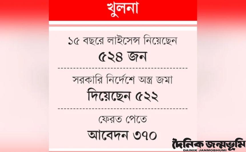 খুলনা জেলা প্রশাসকের কার্যালয় থেকে জানা গেছে, আওয়ামী লীগের তিন মেয়াদে খুলনা থেকে ৫২৪ জনকে অস্ত্রের লাইসেন্স দেওয়া হয়েছিল। এর মধ্যে ৫২২ জন বৈধ অস্ত্র জমা দেন। সরকারি নির্দেশ অমান্য করে অস্ত্র জমা না দেওয়ায় বাগেরহাট-১ আসনের সাবেক সংসদ সদস্য শেখ হেলাল উদ্দিন এবং বটিয়াঘাটার জলমা ইউনিয়নের কাজী মোমিনুল হকের লাইসেন্স বাতিল করা হয়।