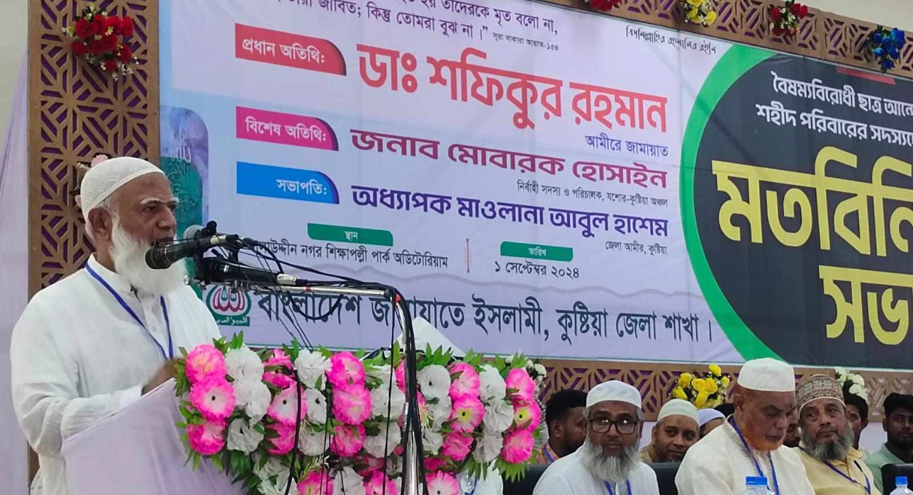রবিবার সকালে (৯টায়) কুষ্টিয়া জেলা জামায়াতের আয়োজনে বৈষম্য বিরোধী ছাত্র আন্দোলনে শহীদ পরিবারের সদস্যদের সাথে মতবিনিময় সভায় প্রধান অতিথির বক্তব্য রাখেন জামায়াতের আমীর ডাঃ শফিকুর রহমান।