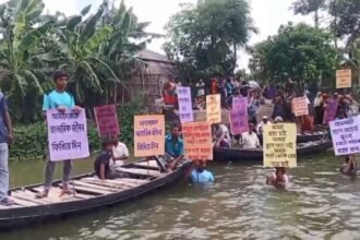 সাতক্ষীরা প্রতিনিধি : ঘূর্ণিঝড় আম্পানে ক্ষতিগ্রস্ত সাতক্ষীরার আশাশুনি উপজেলার প্রতাপনগর ইউনিয়ন পরিষদ থেকে কুড়িকাহুনিয়া পর্যন্ত পানিতে নিমজ্জিত সড়কটি পূণঃনির্মনের দাবীতে নৌকায় ও সড়কের উপর দাড়িয়ে ঘন্টাব্যাপী মানববন্ধন কর্মসুচি পালন করেছে স্থানীয় এলাকাবাসী। প্রতাপনগর ইউনিয়নবাসীর ব্যানারে সোমবার (১৫ জুলাই) দুপুরে এ মানববন্ধন কর্মসূচি পালিত হয়।