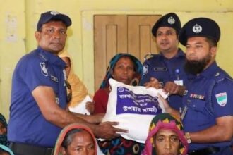 সিরাজুল ইসলাম, শ্যামনগর : আশাশুনির বিছটে নদীর বাঁধ ভেঙ্গে প্লাবিত মানুষের মাঝে পুলিশ উপহার সামগ্রী বিতরণ করেছেন। বুধবার বেলা ১১টায় সাতক্ষীরা জেলা পুলিশের উদ্যোগে এ উপহার সামগ্রী বিতরন করা হয়। এসময় বিছট ওয়াপদা বেড়িবাঁধ ভেঙে প্লাবিত ও পানিবন্দী হয়ে পড়া মানুষদের মাঝে উপহার সামগ্রী বিতরন করা হয়। উপহার সামগ্রী বিতরণ করেন সাতক্ষীরা পুলিশ সুপার মোহাম্মদ মনিরুল ইসলামের পক্ষে অতিরিক্ত পুলিশ সুপার (প্রশাসন ও অর্থ) মুকিত হাসান খাঁন। এসময় আশাশুনি থানার অফিসার ইনচার্জ মোঃ নোমান হোসেন, এসআই রাজিব মন্ডল সহ জেলা পুলিশের বিভিন্ন পদমর্যাদার সদস্যবৃন্দ উপস্থিত ছিলেন।
