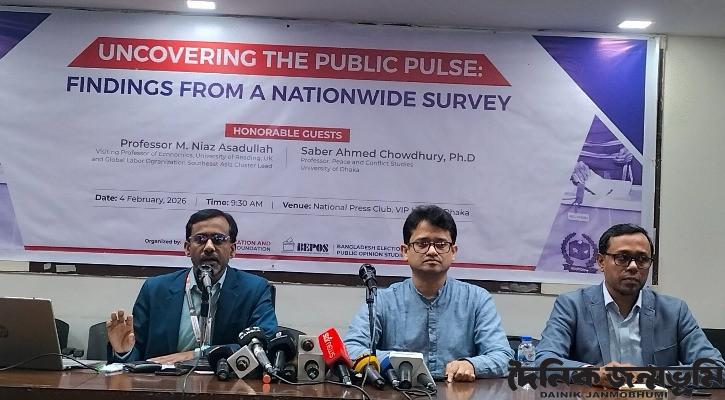 বুধবার (৪ ফেব্রুয়ারি) সকালে রাজধানীর জাতীয় প্রেসক্লাবের ভিআইপি লাউঞ্জে আয়োজিত সংবাদ সম্মেলনে ‘আনকাভারিং দ্য পাবলিক পালস: আ নেশনওয়াইড সার্ভে’ শীর্ষক এক গবেষণা প্রতিবেদন প্রকাশ করা হয়। এই প্রতিবেদনে এসব তথ্য উঠে এসেছে।