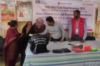 তালা প্রতিনিধি : গত ২০,২১ এবং ২২ অক্টোবর দাতা সংস্থা সিডার অর্থায়নে সেভ দ্য চিলড্রেন ইন্টারন্যাশন্যাল এর সহযোগিতায় উত্তরণ কর্তৃক বাস্তবায়িত BGD SIDA Flash Flood Response 2025 প্রকল্পের মাধ্যমে ফেনী জেলার ফুলগাজী উপজেলার ফুলগাজী সদর, মুন্সিরহাট ও দরবারপুর ইউনিয়নের বন্যায় ক্ষতিগ্রস্থ ৯০০ জন উপকারভোগীদের মাঝে শর্তহীন নগদ টাকা ও হাইজিন কিটস প্রদান করা হয়েছে। উক্ত বিতরণ অনুষ্ঠানে উত্তরণের প্রকল্প সমন্বয়কারী হাসিনা পারভীন এবং ইউনিয়ন পরিষদের সার্বিক ব্যবস্থাপনায়, প্রধান অতিথি হিসাবে উপস্থিত ছিলেন ফুলগাজী উপজেলার সহকারী কমিশনার, ভূমি, মাশিয়াত আক্তার, বিশেষ অতিথি হিসাবে উপস্থিত ছিলেন দায়িত্বপ্রাপ্ত কর্মকর্তা-ফুলগাজী সদর ইউনিয়ন এবং উপজেলা একাডেমিক সুপারভাইজার জনাব মোঃ মোয়াজ্জেম হোসাইন, দায়িত্বপ্রাপ্ত কর্মকর্তা- মুন্সিরহাট ইউনিয়ন ও উপজেলা কৃষি কর্মকর্তা জনাব মোঃ খোরশেদ আলম এবং দায়িত্বপ্রাপ্ত কর্মকর্তা- দরবারপুর ইউনিয়ন ও উপজেলা যুব উন্নয়ন কর্মকর্তা জনাব মোঃ মাসুদুল হক। আরও উপস্থিত ছিলেন, স্ব স্ব ইউনিয়নের প্রশাসনিক কর্মকর্তাগণ এবং সহযোগি সংস্থা সেভ দ্য চিলড্রেন এর অন্তরা দাস তিথি সিনিয়র অফিসার-হিউম্যানিটারিয়ান, মোঃ মোস্তাফিজুর রহমান – প্রজেক্ট অফিসার এবং উত্তরণ এর প্রকল্প স্টাফগণ।