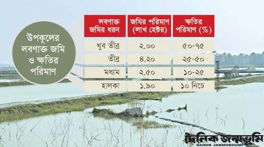 স্বাধীনতার পর ১৯৭৩ সালেও উপকূলীয় অঞ্চলে লবণাক্ত জমির পরিমাণ ছিল ৮ লাখ ৩৩ হাজার হেক্টর। বর্তমানে তা বেড়ে দাঁড়িয়েছে ১০ লাখ ৬০ হাজার হেক্টরে। সে হিসেবে গত চার যুগে উপকূলীয় অঞ্চলে লবণাক্ত জমির পরিমাণ বেড়েছে ২৭ শতাংশের বেশি। এর মধ্যে হালকা মাত্রায় লবণাক্ত জমির পরিমাণ ১ লাখ ৯০ হাজার হেক্টর, মধ্যম মাত্রায় ২ লাখ ৫০ হাজার, তীব্র মাত্রায় ৪ লাখ ২০ হাজার ও খুব তীব্র মাত্রায় লবণাক্ত জমির পরিমাণ ২ লাখ হেক্টর। উপকূলীয় অঞ্চলে এসব এলাকায় মোট আবাদি জমির পরিমাণ ২৮ লাখ ৩০ হাজার হেক্টর। এর মধ্যে চাষযোগ্য ২১ লাখ ৬২ হাজার হেক্টর। সে হিসেবে উপকূলীয় অঞ্চলের চাষযোগ্য জমির প্রায় অর্ধেকই লবণাক্ত। লবণ পানির ভয়াবহতার কারণে প্রতি বছর শুষ্ক মৌসুমে উপকূলীয় এলাকায় পাঁচ লাখ হেক্টরের বেশি জমি অনাবাদি থেকে যায়।