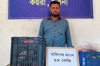 ডেস্ক রিপোর্ট : খুলনার কয়রায় সেলিম হাওলাদারকে ৪৪ কেজি হরিণের মাংসসহ গ্রেফতার করেছে যৌথবাহিনী। বৃহস্পতিবার (৯ অক্টোবর) দিবাগত রাত সাড়ে ১১টার দিকে ৬ নম্বর কয়রা এলাকায় ঘরের ফ্রিজ থেকে এসব মাংস জব্দ করা হয়। গ্রেফতার সেলিম মৃত এইচএম শওকত হোসেনের ছেলে। পুলিশ ও প্রত্যক্ষদর্শীরা জানিয়েছেন, ৬ নম্বর কয়রা লঞ্চঘাট এলাকায় সেলিমের নিজ বাড়ির ফ্রিজ থেকে আনুমানিক ৪৪ কেজি হরিণের মাংস উদ্ধার করে কয়রার নৌবাহিনী কন্টিনজেন্ট। উদ্ধারকৃত হরিণের মাংস এবং অভিযুক্তকে কয়রা থানা পুলিশের নিকট হস্তান্তর করা হয়েছে। কয়রা থানার অফিসার ইনচার্জ মোতালেব হোসেন জানান, আসামির বিরুদ্ধে নিয়মিত মামলা হয়েছে। পরবর্তী আইনি প্রক্রিয়া চলমান আছে।