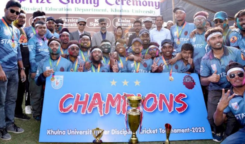 বিজ্ঞপ্তি : খুলনা বিশ্ববিদ্যালয়ে আন্ত:ডিসিপ্লিন ক্রিকেট প্রতিযোগিতায় চ্যাম্পিয়ন হওয়ার গৌরব অর্জন করেছে পরিসংখ্যান ডিসিপ্লিন। বৃহস্পতিবার বেলা ১১টায় বিশ্ববিদ্যালয়ের কেন্দ্রীয় খেলার মাঠে শুরু হওয়া তুমুল উত্তেজনাপূর্ণ ফাইনাল ম্যাচে তারা ৮ উইকেটে ব্যবসায় প্রশাসন ডিসিপ্লিনকে পরাজিত করে। প্রথমে ব্যাট করতে নেমে নির্ধারিত ২০ ওভারে ৫ উইকেটের বিনিময়ে ব্যবসায় প্রশাসন ডিসিপ্লিন ১৪০ রান সংগ্রহ করে। ১৪১ রানের টার্গেটে খেলতে নেমে ১৮.৩ ওভারে ২ উইকেটের বিনিময়ে জয়ের বন্দরে পৌঁছে যায় পরিসংখ্যান ডিসিপ্লিন।
