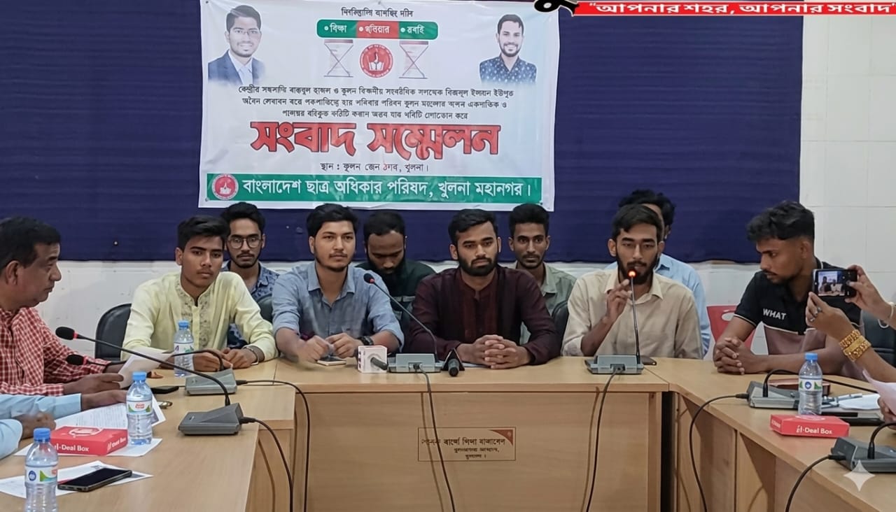 অদ্য ০৪-০৪-২০২৬ তারিখ শনিবার দুপুর ১১ টায় খুলনা প্রেসক্লাবে এক সংবাদ সম্মেলনে ছাত্র অধিকার পরিষদ খুলনা মহানগর এর সাবেক সিনিয়র যুগ্ন সাধারণ সম্পাদক এবং সভাপতি পদপ্রার্থী জুবায়েত শেখ সম্রাট এর নেতৃত্বে অর্ধশতাধিক নেতা কর্মী কেন্দ্র ঘোষিত ৩১-০৩-২০২৬ তারিখের খুলনা মহানগর ছাত্র অধিকার পরিষদ এর গঠিত কমিটি প্রত্যাখান করে। এই সময় উপস্থিত নেতৃত্ববৃন্দ বলেন কেন্দ্রীয় সভাপতি নাজমুল হাসান ও খুলনা বিভাগীয় সাংগঠনিক সম্পাদক জিহাদুল ইসলাম ইউসুফ অবৈধ লেনদেনের ফলে কারোর সাথে আলোচনা না করে পক্ষপাতিত্বে ছাত্র অধিকার পরিষদ খুলনা মহানগর শাখার একপাক্ষিক ও গঠনতন্ত্র বহির্ভূত কমিটি প্রকাশ করায় উক্ত কমিটি প্রত্যাখ্যান করা হলো। একই সাথে এই কমিটি স্থগিত করে আগামী ৩ দিনের মধ্যে স্থানীয় পর্যায়ের সকল নেতাকর্মীদের সাথে আলোচনা সাপেক্ষে পুনরায় কমিটি গঠন করার জোর দাবি জানাচ্ছি। অন্যথায় আমরা পরবর্তি পদক্ষেপ নিতে বাধ্য হবো।
