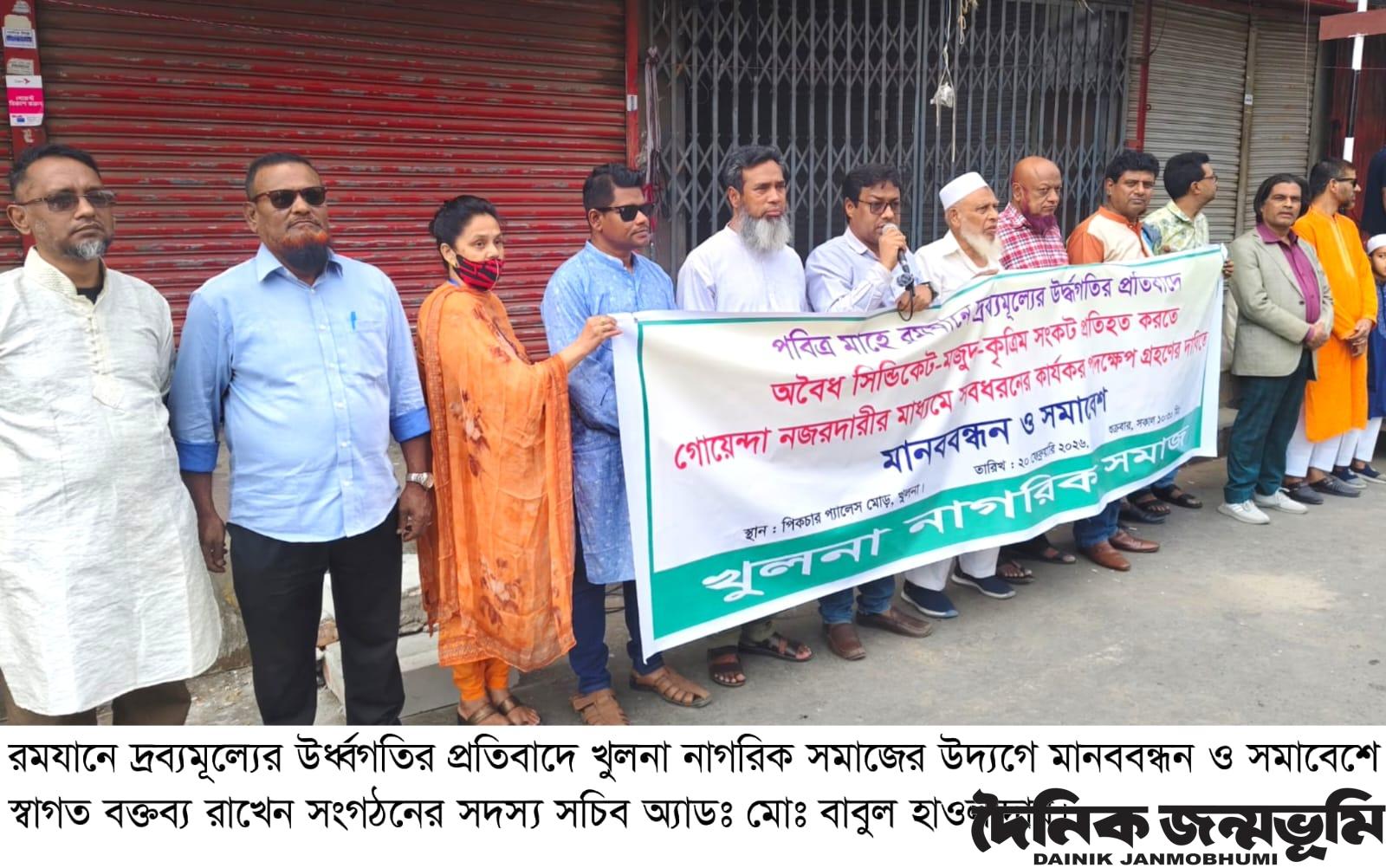 পবিত্র মাহে রমজানে দ্রব্যমূল্যের ঊর্ধ্বগতির প্রতিবাদে, অবৈধ সিন্ডিকেট-মজুদদারদের কৃত্রিম সংকট প্রতিহত করতে এবং গোয়েন্দা নজরদারির মাধ্যমে সব ধরনের কার্যকর পদক্ষেপ গ্রহণের দাবিতে খুলনায় মানববন্ধন কর্মসূচি পালন করা হয়েছে।