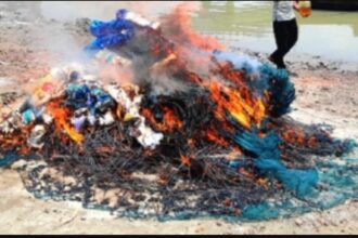 জন্মভূমি রিপোর্ট : মা ইলিশ সংরক্ষনে গত ১৩ অক্টোবর থেকে ইলিশ শিকার, বহন ও বিক্রিতে নিষেধাজ্ঞা জারি করা হয়েছে। খুলনার বিভিন্ন নদ-নদীতে অসাধু জেলেদের বিরুদ্ধে মৎস্য অধিদপ্তর এবং প্রশাসনের বিভিন্ন বাহিনির সদস্যরা অভিযান চালাচ্ছেন। রোববার দুপুরে আতাই নদী হতে ১০ হাজার মিটার কারেন্ট জাল জব্দ হয়েছে। কিন্তু কেউ গ্রেফতার হয়নি, কোনো নৌকাও আটক হয়নি। খুলনা সদও নৌ থানার অফিসার ইনচার্জ (ওসি) মোঃ বাবুল আক্তার দৈনিক জন্মভূমিকে বলেন, নৌ পুলিশ এবং জেলা মৎস্য অধিদপ্তর কর্তৃপক্ষ দুপুর ১২ টা থেকে ভৈরব ও আতাই নদীতে অভিযান শুরু করেন। দুপুর ৩ টা পর্যন্ত চলা অভিযানে ১০ হাজার মিটার কারেন্ট জাল জব্দ করা হয়েছে। জেলেরা নদীতে জাল পেতে রেখে ডাঙ্গায় বসে পাহারা দিচ্ছিলেন। তাই তাদেরকে গ্রেফতার, কিংবা তাদের ব্যবহৃত নৌকা আটক করা সম্ভব হয়নি। জব্দ করা জাল আগুনে পুড়িয়ে ভষ্মিভূত করা হয়েছে।