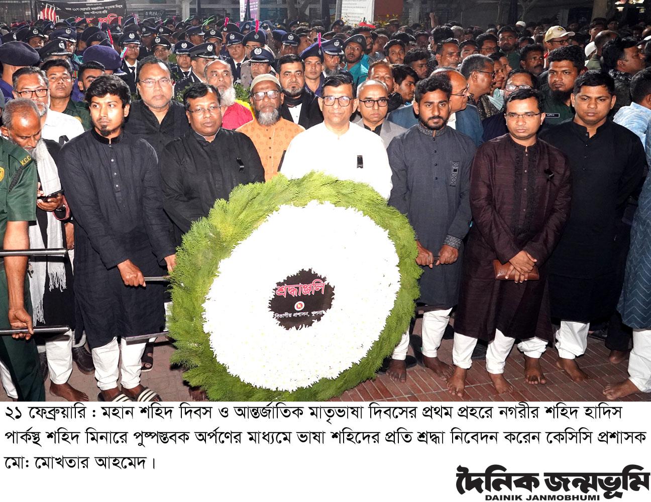 খুলনা সিটি কর্পোরেশন উদ্যোগে যথাযোগ্য মর্যাদায় মহান শহিদ দিবস ও আন্তর্জাতিক মাতৃভাষা দিবস ২০২৬ পালিত হয়েছে। দিবসের প্রথম প্রহরে কেসিসি প্রশাসক মো: মোখতার আহমেদ কর্মকর্তাদের সাথে নিয়ে নগরীর শহিদ হাদিস পার্কস্থ শহিদ মিনারে পুষ্পস্তবক অর্পণের মাধ্যমে ভাষা শহিদদের প্রতি শ্রদ্ধা নিবেদন করেন।