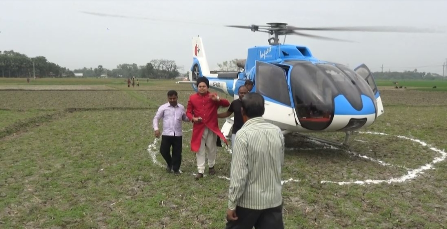 বৃহস্পতিবার বিকালে আত্মীয়দের নিয়ে হেলিকপ্টারে চরে বিয়ে করতে যান একই উপজেলার বেদগ্রামের বিশিষ্ট ব্যাবসায়ী হাজী মো: বাবুল শেখের মেয়ে রুকাইয়া জান্নাতকে। এ সময় হেলিকপ্টারে বরযাত্রী দেখতে এলাকায় শত শত উৎসুক নারী—পুরুষ ভিড় জমায়।