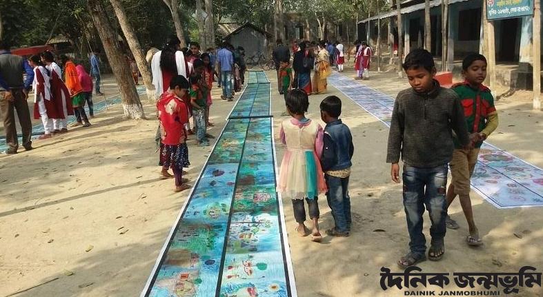 ২০১৮ সালে শিল্পাঞ্জলি’র শিশু-কিশোর চিত্রশিল্পীদের অংকিত বিশাল এই চিত্রটির ৪০০ ফুট অংশ ডিজিটাল প্যানা প্রিন্টে রূপ দেয়া হয়। এরপর শুরু হয় নড়াইল ও যশোরের প্রত্যন্ত গ্রাম অঞ্চলের প্রাইমারি ও মাধ্যমিক স্কুলগুলিতে শিল্পাঞ্জলি’র ক্ষুদে শিল্পীদেও অংকিত বড়চিত্রের ভ্রাম্যমাণ প্রদর্শনী। এ পর্যন্ত যেসব প্রত্যন্ত গ্রামাঞ্চলে ভ্রাম্যমাণ শিশুচিত্র প্রদর্শনী হয়েছে সে গুলির মধ্যে রয়েছে আগদিয়া, মালিয়াট, ভবানীপুর, টাবরা, গোবরা, গুয়াখোলা, বাকড়ী, সীতারামপুর, মুশুড়ি, বাহিরগ্রাম, মুলিয়া ও হিজলডাঙ্গা। উল্লেখ্য এসব গ্রামাঞ্চলের প্রাইমারি ও মাধ্যমিক স্কুল মিলে মোট ২৭টি স্কুলে শিল্পাঞ্জলি’র শিশুশিল্পীদের অঙ্কিত বড় চিত্রের ডিজিটাল প্যানা প্রদর্শিত হয়েছে।