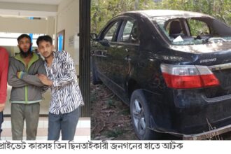 চৌগাছা প্রতিনিধি : যশোরের চৌগাছায় ছিনতাইকালে জনগনের কবলে পড়ে তিন ছিনতাইকারী আটক হয়েছে। এসময় তাদের সাথে থাকা একটি প্রাইভেট কার, একটি পাসপোর্ট ও একটি ড্রাইভিং লাইসেন্স জব্দ করা হয়। বৃহস্পতিবার (০৯ জানুয়ারি) দুপুর দেড়টার দিকে উপজেলার সলুয়া বাজারে এ ঘটনা ঘটে।