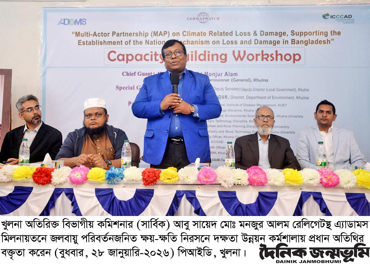 মাল্টি অ্যাক্টর পার্টনারশিপ প্রকল্পের মাধ্যমে বাংলাদেশে জলাবায়ু সহনশীলতার উন্নয়ন ও জলবায়ু পরিবর্তনজনিত ক্ষয়-ক্ষতি নিরসনে জাতীয় কৌশল প্রণয়নে সহযোগিতা কার্যক্রম শীর্ষক প্রকল্পের আওতায় দক্ষতা উন্নয়নে দিনব্যাপী কর্মশালা আজ (বুধবার) খুলনা রেলিগেটস্থ এ্যাডামস মিলনায়তনে অনুষ্ঠিত হয়। কর্মশালায় প্রধান অতিথি ছিলেন খুলনা অতিরিক্ত বিভাগীয় কমিশনার (সার্বিক) আবু সায়েদ মোঃ মনজুর আলম। বেসরকারি উন্নয়ন সংস্থা অ্যাডামস ফাউন্ডেশন এ অনুষ্ঠানের আয়োজন করে।