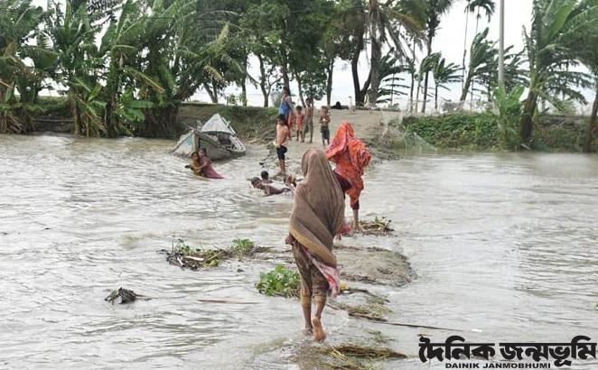 মেঘনা নদী ছাপিয়ে জোয়ারের পানি ঢুকেছে লক্ষ্মীপুরের কমলনগরের বাত্তিরখালে