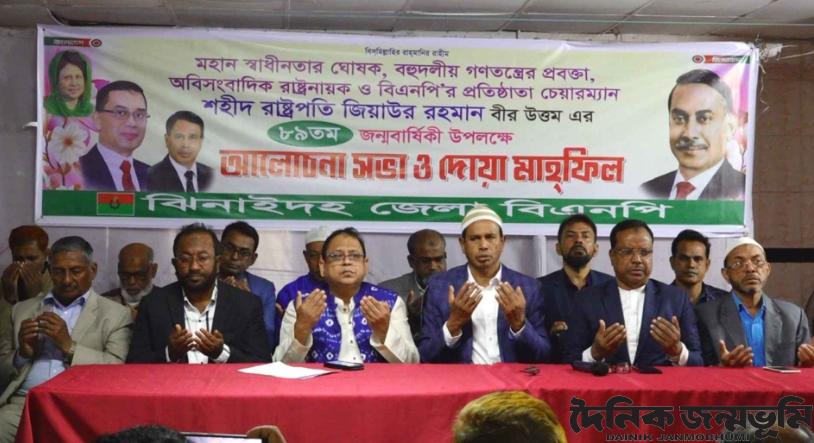 জন্মভূমি ডেস্ক : ঝিনাইদহে শহীদ রাষ্ট্রপতি ও বিএনপির প্রতিষ্ঠাতা জিয়াউর রহমানের ৮৯তম জন্মদিন পালিত হয়েছে। এ উপলক্ষে রোববার (১৯ জানুয়ারি) সকালে শহরের একটি বেসরকারি কমিউনিটি সেন্টারে জেলা বিএনপি দোয়া ও আলোচনা সভার আয়োজন করে। জেলা বিএনপির সহ-সভাপতি অ্যাড কামাল আজাদ পান্নুর সভাপতিত্বে অনুষ্ঠানে প্রধান অতিথি হিসাবে বক্তব্য দেন জেলা বিএনপির সভাপতি অ্যাড. আব্দুল মজিদ। আরও উপস্থিত ছিলেন, সাধারণ সম্পাদক জাহিদুজ্জামান মনা, সাংগঠনিক সম্পাদক সাজেদুর রহমান পাপ্পুসহ জেলা ও উপজেলা থেকে আগত বিএনপি, ছাত্রদল, যুবদল, মহিলাদল, কৃষক দলের বিভিন্ন পর্যায়ের নেতারা। এসময় বক্তারা বলেন, শহীদ রাষ্ট্রপতি বাংলাদেশকে নতুন ও সম্ভাবনাময় দেশ গড়ে তুলে বিশ্বের বুকে মাথা উঁচু করে দাঁড়ানোর স্বপ্ন দেখান। স্বৈরাচার শেখ হাসিনার প্রেতাত্মারা এখনও দেশকে অস্থিতিশীল করতে বিভিন্ন ষড়যন্ত্র করে যাচ্ছে। আওয়ামী লীগের দুঃশাসন থেকে দেশ মুক্তি পেয়েছে। কিন্তু মানুষের ভোটের অধিকার এখনও প্রতিষ্ঠিত হয়নি।