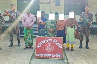 ডেস্ক রিপোর্ট : ঝিনাইদহের মহেশপুর সীমান্তে অভিযান চালিয়ে নারী শিশু সহ ৬ বাংলাদেশিকে আটক করেছে বিজিবি। আটকদের মধ্যে দুইজন নারী ও দুইজন শিশু।মঙ্গলবার সকাল সাড়ে ৯টার দিকে মহেশপুরের বাঘডাঙ্গা সীমান্তের সীমান্ত পিলার ৬০/৩৭ সংলগ্ন এলাকা থেকে তাদের আটক করা হয়। মঙ্গলবার বিকাল ৩টার দিকে মহেশপুর ৫৮ বিজিবি ব্যাটেলিয়নের সহকারী পরিচালক মুন্সি ইমদাদুর রহমান এ তথ্য নিশ্চিত করা হয়েছে।আটক প্রাপাত বয়স্ক পুরুষ দুজন হলেন, নোয়াখালীর চর আমানউল্লাহ গ্রামের হরিধন জলদাসের ছেলে কৃষ্ণ জলদাস (৪০) ও একই গ্রামের রবি জলদাসের ছেলে কিরণ জলদাস (২৭)।
