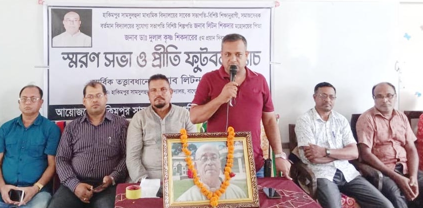 চুলকাটি(বাগেরহাট)প্রতিনিধি : বাগেরহাট সদর উপজেলার খানপুর ইউনিয়নের হাকিমপুর সামসুলহুদা মাধ্যমিক বিদ্যালয় মাঠে বিশিষ্ট শিক্ষানুরাগী স্বর্গীয় ডাঃ দুলাল কৃষ্ণ শিকদারের ৫ম প্রয়ান দিবস স্বরণে প্রীতিফুটবল টুর্নামেন্ট ও স্বরণ সভা মঙ্গলবার (১৬ জুলাই) বিকেল ৪টায় অনুষ্ঠিত হয়েছে। শেখ কামরুজ্জামান এর সভাপতিত্বে স্বরণ সভায় প্রধান অতিথি হিসাবে উপস্থিত ছিলেন, চুলকাটি পুলিশ তদন্ত কেন্দ্রের আইসি ইন্সপেক্টর বিকাশ চন্দ্র ঘোষ, বিশেষ অতিথি ছিলেন, হাকিমপুর নিন্ম মাধ্যমিক বালিকা বিদ্যালয়ের সাবেক সভাপতি শিশির শিকদার। মাওলানা মোহম্মদ শরিফুল ইসলাম এর সঞ্চালনায় এতে আরো বক্তৃতা করেন, প্রধান শিক্ষক বসুদেব পাল, সিনিয়র শিক্ষক হেমায়েত উদ্দিন শেখ, সঞ্জিত রায় ও চুলকাটি প্রেসক্লাবের সাধারন সম্পাদক শেখ আনিছুর রহমান, কামাল হোসেন ও আমজাদ হোসেন। এর আগে পদ্মা স্পটিং ক্লাব বনাম মেঘনা স্পটিং ক্লাবের মধ্যকার খেলায় ১-১ গোলে অমিমাংসিত হয়। খেলা পরিচালানা করেন দীপক কুমার মন্ডল, তাকে সহযোগীতা করেন সুমন পাল ও পার্থ সাহা।