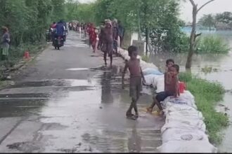 এস রফিক, ডুমুরিয়া : ডুমুরিয়ায় ঘেংরাইল-ভদ্রানদীতে অস্বাভাবিক পানি বৃদ্ধি পাওয়ায় বারুইকাটি পাকা সড়কের উপর দিয়ে পানি উপচে পড়ে ও মাদারতলা পুরাতন কালভার্টের মুখ ভেঙে ভিতরে জোয়ারে পানি ঢুকে প্লাবিত হওয়ার আশংকায় ৮ গ্রামের মানুষ। রাতে দিনে গ্রামবাসী স্বেচ্ছাশ্রমে নিরলসভাবে কাজ করে যাচ্ছে বাঁধ রক্ষায়। তবে পানি উন্নয়ন বোর্ড বলছেন অতি দ্রুত সড়কের পাশ দিয়ে রিং বাঁধ দেয়ার ব্যবস্থা করা হবে।