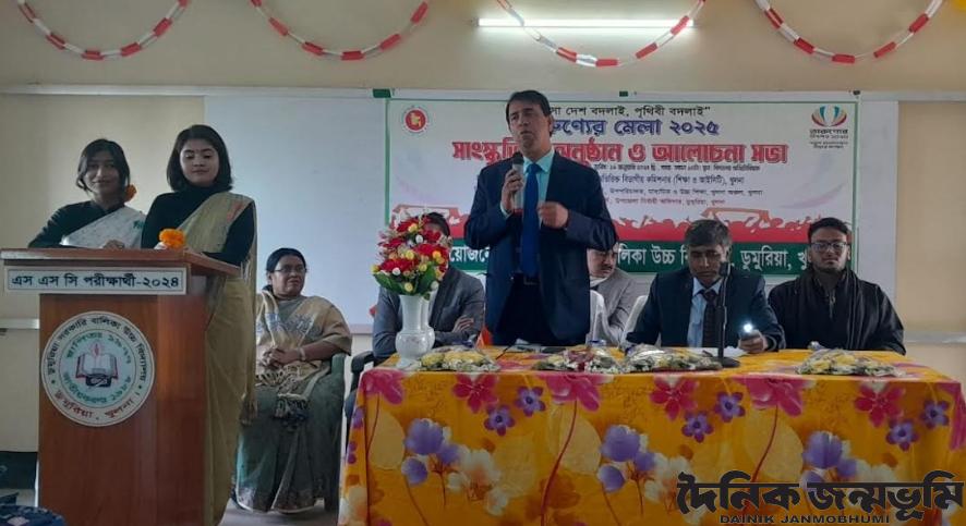 শেখ মাহতাব হোসেন, ডুমুরিয়া : এসো দেশ বদলাই, পৃথিবী বদলাই” তারুণ্যের উৎসব ২০২৫ নতুন বাংলাদেশ গড়ার লক্ষ্যে সাংস্কৃতিক অনুষ্ঠান ও আলোচনা সভা ডুমুরিয়া সরকারি বালিকা উচ্চ বিদ্যালয়, ডুমুরিয়া, খুলনার আয়োজনে রবিবার ১৯ জানুয়ারি সকাল ১০টা ডুমুরিয়া সরকারি মহিলা মাধ্যমিক বিদ্যালয় অডিটোরিয়াম আলোচনা সভা অনুষ্ঠিত হয়। সভায় সভাপতিত্ব করেন ডুমুরিয়া উপজেলা সহকারী কমিশনার ভূমি মোঃ আসাদুর রহমান, প্রধান অতিথি: দেবপ্রসাদ পাল, অতিরিক্ত বিভাগীয় কমিশনার (শিক্ষা ও আইসিটি), খুলনা বিশেষ অতিথি: মোঃ কামরুজ্জামান, উপপরিচালক, মাধ্যমিক ও উচ্চ শিক্ষা, খুলনা অঞ্চল, খুলনা। দিবাশীষ বিশ্বাস মাধ্যমিক শিক্ষা অফিসার ডুমুরিয়া খুলনা।উপস্হিত ছিলেন সালমা রহমান প্রধান শিক্ষকা ডুমুরিয়া সরকারি বালিকা উচ্চ বিদ্যালয়, সহকারী প্রধান শিক্ষক আবু তৈয়েব মো: ইউনুছ, সিনিয়র শিক্ষক রতন বিশ্বাস, ভারত চন্দ্র সরদার সহ অন্যান্য শিক্ষকবৃন্দ।সমগ্র অনুষ্ঠান পরিচালনা করেন নবম শ্রেণির শিক্ষার্থী জান্নাতুল ফেরদৌসী সিন্থিয়া ও সোহানা মার্জানা অহনা। প্রমুখ।।