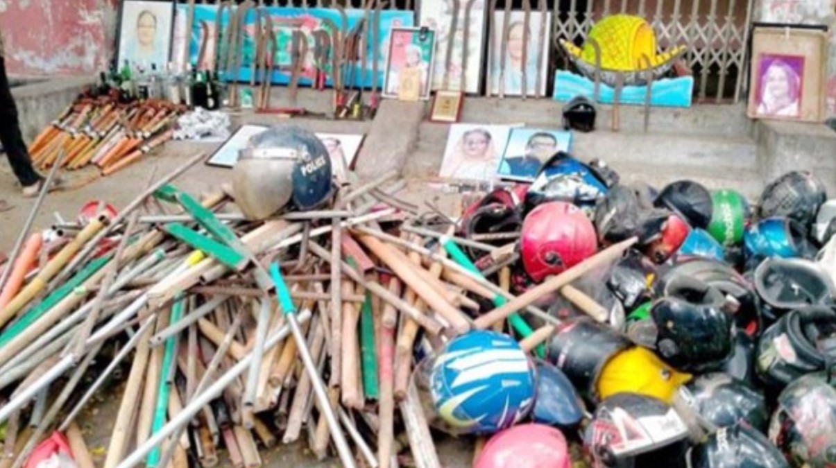 আজ শনিবার (১৭ আগষ্ট) সকাল থেকে দুপুর পর্যন্ত ঢাকা কলেজের সাতটি হলে তল্লাশি চালিয়ে এসব অস্ত্র উদ্ধার করা হয়। অভিযানে অংশগ্রহণকারী শিক্ষার্থীরা বলছেন, এসব সরঞ্জাম দিয়ে ক্যাম্পাসের পাশাপাশি আশপাশের এলাকায় ত্রাসের রাজত্ব কায়েম করতেন ছাত্রলীগ নেতাকর্মীরা।