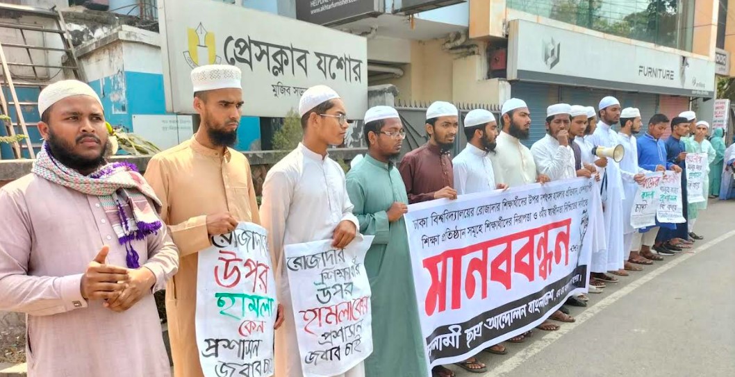 যশোর প্রতিনিধি : যশোরে ঢাকা বিশ্ববিদ্যালয়ের রোজাদার শিক্ষার্থীদের উপরে নৃশংস হামলার প্রতিবাদ মানববন্ধন অনুষ্ঠিত হয়েছে। আজ শুক্রবার সকাল ১১টায় ইসলামী ছাত্র আন্দোলন বাংলাদেশ এমএম কলেজ শাখার উদ্যোগে প্রেসক্লাব যশোরের সামনে এ মানববন্ধন করা হয়।