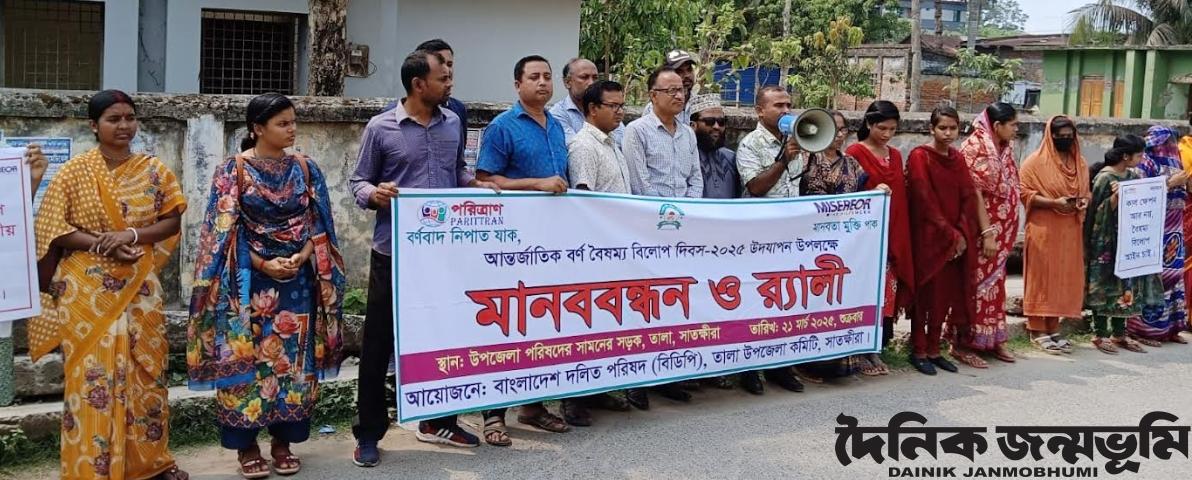 তালা প্রতিনিধি : সাতক্ষীরার তালায় আন্তর্জাতিক বর্ণ বৈষম্য বিলোপ দিবস পালিত হয়েছে। দিবসটি উপলক্ষে শুক্রবার (২১ মার্চ) সকালে তালা উপজেলা পরিষদের সামনের সড়কে বেসরকারি মানবাধিকার উন্নয়ন সংগঠন পরিত্রাণ ও বাংলাদেশ দলিত পরিষদ (বিডিপি) তালা উপজেলা শাখা কর্তৃক মানববন্ধন ও র্যালী অনুষ্ঠিত হয়। অনুষ্ঠানে সভাপতিত্ব করেন বাংলাদেশ দলিত পরিষদ (বিডিপি) তালা উপজেলা শাখার সভাপতি প্রবীর দাস। মানববন্ধনে বক্তব্য রাখেন তালা মহিলা ডিগ্রী কলেজের অধ্যক্ষ (ভারপ্রাপ্ত) সেখ শফিকুল ইসলাম, সাংবাদিক মোস্তাফিজুর রহমান রেন্টু, বাংলাদেশ দলিত পরিষদের সাধারন সম্পাদক পলাশ দাস, পরিত্রাণের কর্মসূচী সমন্বয়কারী মোঃ রবিউল ইসলাম, উদ্দীপ্ত মহিলা সংস্থার উপদেষ্টা দিলীপ দাস, পিন্টু মন্ডল, কমলা দাস, রেবতা দাস, শান্ত্বনা দাস, কংকনা দাস প্রমুখ।