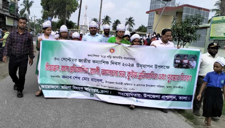 তালা প্রতিনিধি : ‘কন্যাশিশুর স্বপ্নে গড়ি আগামীর বাংলাদেশ’ এই শ্লোগান সামনে রেখে সোমবার (৩০ সেপ্টেম্বর) তালায় জাতীয় কন্যাশিশু দিবস পালিত হয়েছে। দিবসটি উপলক্ষ্যে উপজেলা মহিলা বিষয়ক অধিদপ্তরের আয়োজনে ও উপজেলা প্রশাসনের সহযোগিতায় র্যালি, আলোচনা সভা, চিত্রাঙ্কন ও রচনা, কুইজ প্রতিযোগিতা এবং পুরষ্কার বিতরণ করা হয়। সকালে উপজেলা পরিষদ চত্বর থেকে র্যালি শুরু হয়ে বিভিন্ন সড়ক প্রদক্ষিণ করে শিল্পকলা একাডেমিতে এসে শেষ হয়ে সেখানে আলোচনা সভা অনুষ্ঠিত হয়। অনুষ্ঠানে সভাপতিত্ব করেন তালা উপজেলা নির্বাহী কর্মকর্তা শেখ মোঃ রাসেল। উপজেলা মহিলা বিষয়ক কর্মকর্তা নাজমুন নাহারের সঞ্চালনায় অনুষ্ঠানে বক্তব্য রাখেন তালা উপজেলা মাধ্যমিক শিক্ষা অফিসার সেখ ফিরোজ আহমেদ, মহিলা কলেজের ভারপ্রাপ্ত অধ্যক্ষ সেখ সফিকুল ইসলাম, মাধ্যমিক শিক্ষা অফিসের একাডেমিক সুপারভাইজার প্রভাস কুমার দাস, সাংবাদিক বিএম জুলফিকার রায়হান, এনজিও প্রতিনিধি রনজিৎ দাস, প্রভাবী শীল, স্কুলছাত্রী সুবর্ণা ফিরোজ ঐশী প্রমুখ।
