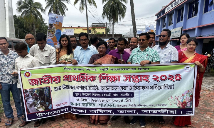 তালা প্রতিনিধি : ‘শিশু বান্ধব শিক্ষা, স্মার্ট বাংলাদেশের দীক্ষা’ এ স্লোগানকে সামনে রেখে সাতক্ষীরার তালায় জাতীয় প্রাথমিক শিক্ষা সপ্তাহ পালিত হয়েছে। এ উপলক্ষে মঙ্গলবার (২৮ মে) দিনব্যাপী উপজেলা পরিষদ চত্বরে র্যালি শেষে শিল্পকলা একাডেমি মিলনায়তনে আলোচনা সভা ও চিত্রাঙ্কন প্রতিযোগিতা অনুষ্ঠিত হয়। উপজেলা শিক্ষা অফিস আয়োজিত অনুষ্ঠানে সভাপতিত্ব করেন তালা উপজেলা নির্বাহী কর্মকর্তা আফিয়া শারমিন। অনুষ্ঠানে প্রধান অতিথি হিসেবে উপস্থিত ছিলেন তালা উপজেলা পরিষদের চেয়ারম্যান ঘোষ সনৎ কুমার। স্বাগত বক্তব্য রাখেন উপজেলা শিক্ষা অফিসার (প্রাথমিক) গাজী সাইফুল ইসলাম। বিশেষ অতিথি হিসেবে উপস্থিত ছিলেন তালা প্রেসক্লাবের সভাপতি ও খলিলনগর ইউপি চেয়ারম্যান প্রণব ঘোষ বাবলু, রিসোর্স সেন্টারের ইন্সট্রাক্টর মকবুল হোসেন, সহকারী প্রোগ্রামার প্রকৌশলী রেজাউল করিম, প্রকল্প বাস্তবায়ন কর্মকর্তা মোঃ ওবায়দুল হক প্রমুখ। সমাপনী অনুষ্ঠানে প্রধান অতিথি হিসেবে উপস্থিত ছিলেন সাতক্ষীরা জেলা প্রাথমিক শিক্ষা অফিসার হোসনে ইয়াসমিন করিমী। বিশেষ অতিথি হিসেবে উপস্থিত ছিলেন সাতক্ষীরা জেলা সহকারী প্রাথমিক শিক্ষা অফিসার মোঃ মোজাফ্ফর উদ্দীন। এ সময় উপজেলা শিক্ষা অফিসের সহকারী শিক্ষা কর্মকর্তা ছাড়াও উপজেলার প্রাথমিক বিদ্যালয়ের শিক্ষক, শিক্ষিকা, শিক্ষার্থী, সাংবাদিক ও সুশীল সমাজের প্রতিনিধিরা উপস্থিত ছিলেন।
