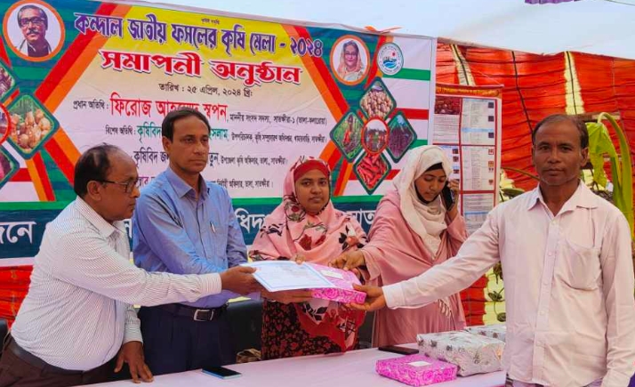তালা প্রতিনিধি : সাতক্ষীরা তালায় তিন দিনব্যাপী কন্দাল ফসল উন্নয়ন কৃষি মেলার সমাপনী ও পুরষ্কার বিতরণ বৃহস্পতিবার (২৫ এপ্রিল)অনুষ্ঠিত হয়েছে। উপজেলা কৃষি সম্প্রসারণ অধিদপ্তরের আয়োজনে অনুষ্ঠিত মেলার সমাপনীতে উপস্থিত ছিলেন তালা উপজেলা সহকারি কমিশনার (ভূমি) আরাফাত হোসেন, উপজেলা কৃষি অফিসার হাজিরা খাতুন, কৃষি সম্প্রসারণ অফিসার আফরোজা খাতুন রুমা, মাধ্যমিক শিক্ষা অফিসার সেখ ফিরোজ আহমেদ প্রমুখ। এ সময় ৬ জনকে পুরষ্কৃত করা হয়।
