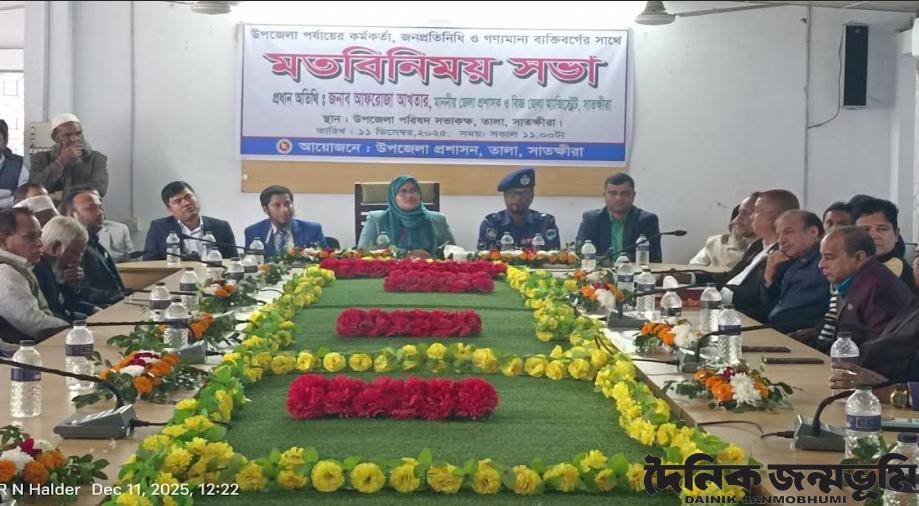 তালা প্রতিনিধি : তালায় উপজেলা পর্যায়ের কর্মকর্তা, জনপ্রতিনিধি ও গণ্যমান্য ব্যক্তিবর্গের সাথে মতবিনিময় সভা করেন নবাগত সাতক্ষীরা জেলা প্রশাসক আফরোজা আখতার। বৃহস্পতিবার (১১ ডিসেম্বর) বেলা সাড়ে ১১টায় উপজেলা প্রশাসনের আয়োজনে তালা উপজেলা পরিষদের সভাকক্ষে অনুষ্ঠিত মতবিনিময় সভায় সভাপতিত্ব করেন তালা উপজেলার নির্বাহী কর্মকর্তা তারেক হাসান। এ সময় বক্তব্য রাখেন উপজেলা সহকারী কমিশনার (ভূমি) রাহাত খান, তালা থানার অফিসার ইনচার্জ (ওসি) মো. শহিদুল ইসলাম, সাতক্ষীরা জেলা জামায়াতের নায়েবে আমীর ডা. মাহমুদুল হক, তালা উপজেলা বিএনপির সাবেক সভাপতি মৃণাল কান্তি রায়, সাধারণ সম্পাদক ও মহিলা কলেজের অধ্যক্ষ সেখ শফিকুল ইসলাম, মুক্তিযোদ্ধা মোঃ মফিজ উদ্দীন, জালালপুর ইউপি চেয়ারম্যান এম মফিজুল হক লিটু, ইসলামকাটি ইউপি চেয়ারম্যান গোলাম ফারুক, শহীদ কামেল মডেল হাইস্কুলের প্রধান শিক্ষক গাজী জাহিদুর রহমান, সাবেক অধ্যক্ষ মোঃ আব্দুর রহমান, তালা প্রেসক্লাবের সভাপতি এস এম হাকিম, পাটকেলঘাটা প্রেসক্লাবের সভাপতি আব্দুল মোমিন, উপজেলা প্রেসক্লাবের সভাপতি আকবর হোসেন, উপজেলা নাগরিক কমিটির সাধারণ সম্পাদক শফিকুল ইসলাম, ব্যবসায়ী প্রতিনিধি অঅব্দুল লতিফ, বৈষম্যবিরোধী ছাত্র আন্দোলনের নেতা রাকিবুল ইসলাম রাকিব, মীর্জা সাকিব প্রমুখ। মতবিনিময় সভায় উপস্থিত ছিলেন বিভিন্ন দপ্তরের সরকারি কর্মকর্তাবৃন্দ, মুক্তিযোদ্ধা, জনপ্রতিনিধি, রাজনৈতিক ব্যক্তিবর্গ, এনজিও প্রতিনিধি, সাংবাদিক, শিক্ষক, সুধীজন, বৈষম্যবিরোধী ছাত্র আন্দোলনের নেতৃবৃন্দ। এ সময় তিনি উপজেলা চত্বরে বৃক্ষরোপন করেন এবং বিভিন্ন শিক্ষা প্রতিষ্ঠানে ক্রীড়া সামগ্রী বিতরণ করেন।