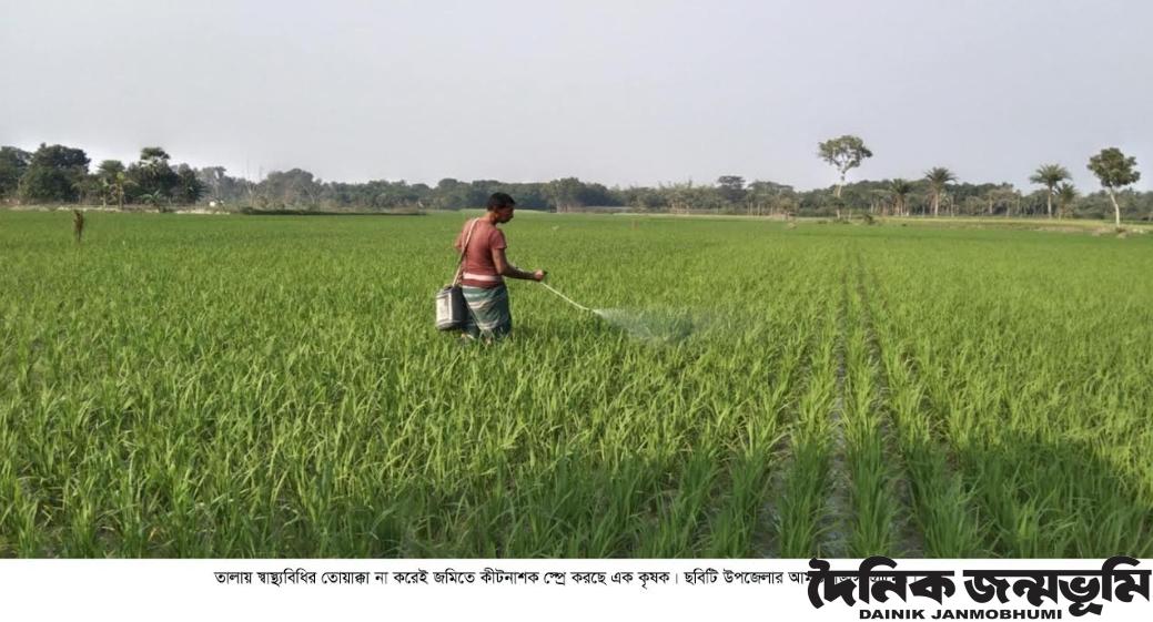 নেই কারও নাকে-মুখে মাস্ক বা কাপড়। হাতে নেই কোনো হাতমোজা বা গ্লাভস। কাঁধে ঝোলানো মেশিনে ভর্তি কীটনাশক। এভাবেই প্রতিদিন রোপা আমন বিস্তীর্ণ ধানক্ষেতে কীটনাশক স্প্রে করছেন কৃষকরা। সকাল ৮টার পূর্বে এবং বিকাল ৪টার পর কীটনাশক স্প্রে করার উপযোগী সময় এবং সার ও কীটনাশক স্প্রে করতে হলে বিশেষ পোশাক পরিধান করার নিয়ম রয়েছে।