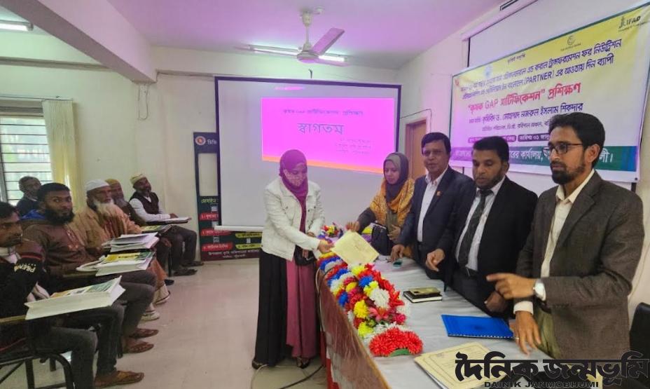 আহাম্মদ ইব্রাহিম অরবিল, দশমিনা(পটুয়াখালী) : উত্তম কৃষি চর্চা এবং কৃষি বান্ধব হিসাবে উপজেলাকে গড়ে তোলার লক্ষ্যে পটুয়াখালীর দশমিনা উপজেলায় কৃষকদেরকে নিয়ে দিনব্যাপি সার্টিফিকেশন প্রশিক্ষন অনুষ্ঠিত হয়। উপজেলা কৃষি সম্প্রসারন অধিদপ্তরের আয়োজনে কৃষক প্রশিক্ষন কেন্দ্রে কৃষকদেরকে এই প্রশিক্ষ প্রদান করা হয়। ২০২৪-২০২৫ অর্থ বছরে প্রোগ্রাম অন এগ্রিকালচারাল এন্ড রুরাল ট্রান্সফরমেশন ফর নিউট্রিশন এন্টারপ্রেনরশীপ এন্ড রেসিলিয়েন্স ইন বাংলাদেশ(পার্টনার) এর আওতায় দিনব্যাপি”কৃষক জিএপি সার্টিফিকেশন”প্রশিক্ষন অনুষ্ঠানে প্রধান অতিথি ছিলেন কৃষি সম্প্রসারন অধিদপ্তরের বরিশাল অঞ্চলের অতিরিক্ত পরিচালক কৃষিবিদ ডঃ মোহাম্মদ নজরুল ইসলাম শিকদার। প্রশিক্ষন অনুষ্ঠানে বিশেষ অতিথি ছিলেন কৃষি সম্প্রসারন অধিদপ্তরের পটুয়াখালীর উপপরিচালক মো. নজরুল ইসলাম ও পার্টনার প্রকল্পের মনিটরিং অফিসার মোসাঃ ফাহিমা হক। প্রশিক্ষন অনুষ্ঠানে সভাপতিত্ব করেন উপজেলা কৃষি কর্মকর্তা কৃষিবিদ মো. জাফর আহমেদ। প্রশিক্ষনে উপজেলার প্রান্তিক ২৫ জন কৃষককে প্রশিক্ষন প্রদান শেষে সার্টিফিকেট বিতরন করা হয়।