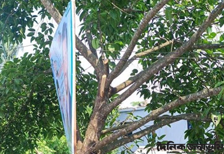 দশমিনায় পেরেক ঢুকিয়ে ফেস্টুন টাঙ্গিয়ে প্রচার প্রচারনা