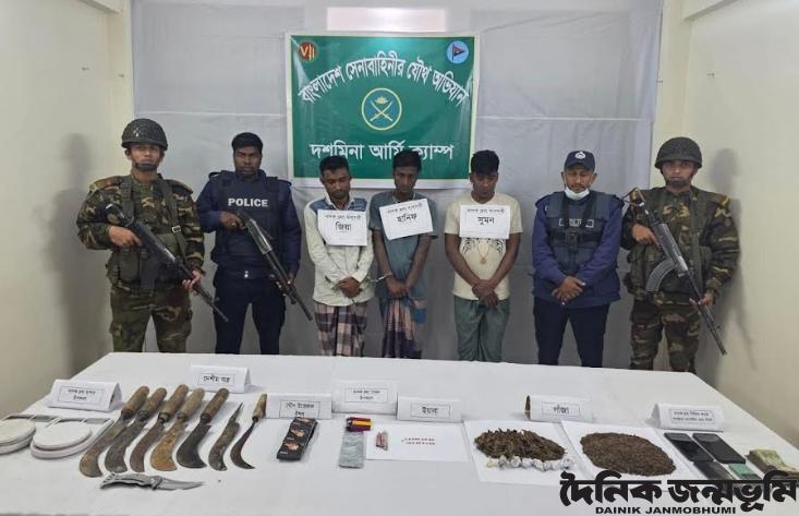 দশমিনা(পটুয়াখালী)প্রতিনিধি : পটুয়াখালীর দশমিনা উপজেলার বিভিন্ন স্থানে বাংলাদেশ সেনাবাহিনী ও পুলিশ যৌথ অভিযান পরিচালনা করে বিপুল পরিমান মাদকদ্রব্য,দেশী অস্ত্র ও বিভিন্ন ধরনের যৌন উত্তেজক ট্যাবলেটসহ ৩জনকে গ্রেফতার করা হয়। বাংলাদেশ সেনাবাহিনীর দশমিনা কন্টিনজেন্ট কমান্ডার মেজর তানজিল’র নির্দেশে সেনাবাহিনী ও পুলিশ যৌথ অভিযান করে মাদক ব্যবসায়ী জিয়া,হানিফ ও সুমনকে গ্রেফতার করেছে। আটককৃতদের বিরুদ্ধে আইনগত ব্যবস্থা নেয়ার জন্য তাদেরকে থানার পুলিশের নিকট হস্তান্তর করা হয়।