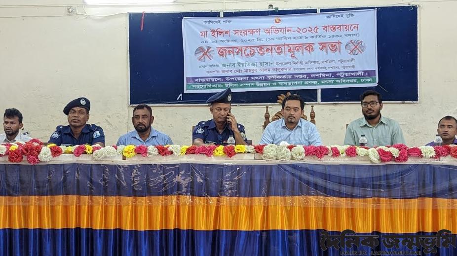 দশমিনা (পটুয়াখালী) প্রতিনিধি : পটুয়াখালীর দশমিনা উপজেলায় মৎস্য অধিদপ্তরের আয়োজনে পরিষদের মিলনায়তনে মা ইলিশ সংরক্ষণে জনসচেতনতামূলক সভা অনুষ্ঠিত হয়। উপজেলা মৎস্য কর্মকর্তা মো. মাহাবুব আলম তালুকদার’র সভাপতিত্বে সভায় প্রধান অতিথি হিসাবে উপস্থিত ছিলেন উপজেলা নির্বাহী কর্মকর্তা (ইউএনও) ইরতিজা হাসান। বিশেষ অতিথি হিসাবে উপস্থিত ছিলেন থানার ভারপ্রাপ্ত পুলিশ কর্মকর্তা মোহাম্মাদ আবদুল আলীম। সভায় উপস্থিত ছিলেন নৌ পুলিশ ফাঁড়ির ইনচার্জ মো. ফেরদাউস,উপজেলা প্রকল্প বাস্তবায়ন কর্মকর্তা মিঠুন চন্দ্র হাওলাদার, উপজেলা মেরিন ফিসারিশ কর্মকর্তা মো.নাজমুল হাসান পলাশ, উপজেলা মৎস্যজীবী দলের সভাপতি মোহাম্মদ ইব্রাহিম, সাধারণ সম্পাদক হাবিবুর রহমানসহ উপজেলার বিভিন্ন মৎস্য ব্যবসায়ী ও মৎস্যজীবীগন।