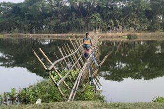 বিধান চন্দ্র ঘোষ, দাকোপ (খুলনা) : খুলনার দাকোপে ফকির ডাঙ্গা ও শিবনগর এলাকার মাঝে কামার গোদা নদীর উপর জরাজীর্ণ বাঁশের সাঁকো দিয়ে জীবনের ঝুঁকি নিয়ে পারাপার হচ্ছে স্কুলগামি ছাত্র ছাত্রীসহ এলাকার জনসাধারণ। ওই নদীর উপর এলাকাবাসীর দীর্ঘদিনের একটি ব্রীজের স্বপ্ন আজও পর্যন্ত পূরন হয়নি। এমনকি বিভিন্ন দপ্তরে একাধিক বার আবেদন করেও কোন প্রতিকার মেলেনি বলে এলাকাবাসীর অভিযোগ।