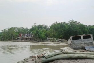 বিধান চন্দ্র ঘোষ, দাকোপ (খুলনা) : খুলনার উপকূলীয় দাকোপের বটবুনিয়া এলাকায় পানি উন্নয়ন বোর্ডের প্রায় ১৫০ ফুট ওয়াপদা বেড়িবাঁধ ভেঙে ঢাকি নদী গর্ভে বিলীন হয়ে ব্যাপক এলাকা প্লাবিত হয়েছে। পানির নীচে তলিয়ে রয়েছে প্রায় কয়েক হাজার হেক্টও রোপা আমন ধানের ক্ষেত। ভেসে গেছে কয়েক লক্ষ টাকার পুকুরের মাছ। পানি বন্ধি হয়ে পড়েছে প্রায় ১ হাজার পরিবার। পাউবো ও স্থানীয় জনপ্রতিনিধিদের উদ্যোগে ভাঙন কবলিত স্থানে বাঁধ পুনঃ নির্মানের চেষ্টা অব্যহত রয়েছে। তিলডাঙ্গা ইউপি চেয়ারম্যান মোঃ জালাল উদ্দিন গাজি জানান, চলতি অমাবস্যার গোনে ঢাকি নদীর জোয়ারের অতিরিক্ত পানির চাপে মঙ্গলবার দিন গত রাত ১২টার দিকে তিলডাঙ্গা ইউনিয়নের বটবুনিয়া বাজারের পশ্চিম পাশে হরি মন্দির সংলগ্ন এলাকায় পাউবোর প্রায় ১৫০ ফুট ঝুঁকিপূর্ণ ওয়াপদা বেড়িবাঁধ ভেঙে ঢাকি নদী গর্ভে বিলিন হয়। বুধবার সকালে ভাটায় জিও টিউবে বালি ভরে বাঁধ আটকানো চেষ্টা করা হয়। কিন্তু ব্যর্থ হওয়ায় দুপুরের জোয়ারে আবার এলাকায় পানি ঢুকছে। বর্তমানে এলাকার অনেক লোকজন দিন রাত পরিশ্রম করে বাঁধ পুনঃ নির্মানের চেষ্টা চালিয়ে যাচ্ছে। অতি দ্রুত বাঁধ আটকাতে না পারলে আমন ফসলসহ জনসাধারণের ব্যাপক ক্ষয়ক্ষতি হবে। এব্যাপারে পানি উন্নয়ন বোর্ডের নির্বাহী প্রকৌশলী আশরাফুল আলম জানান, সকালে ভাঙন কবলিত স্থানে বাঁধ আটকানো চেষ্টা চলছিল কিন্তু নদীতে জোয়াওে পানি ভর্তি হয়ে যাওয়ায় সম্ভব হয়নি। সকল প্রকার প্রস্তুতি নেওয়া হয়েছে। আশা করছি পরবর্তী জোয়ার আসার পূর্বে বাঁধ আটকাতে পারবো।