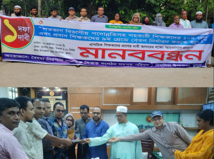 ২রা অক্টোবর বুধবার বিকাল সাড়ে ৪ টার সময় দিঘলিয়া উপজেলা প্রাথমিক শিক্ষক সংগঠন সমন্ময় পরিষদের উদ্যোগে দিঘলিয়া উপজেলা চত্বরে এক মানববন্ধন কর্মসূচি ও স্থানীয় প্রশাসন বরাবর স্মারকলিপি প্রদান করা হয়। উক্ত মানববন্ধন কর্মসূচিতে উপস্থিত থেকে বক্তব্য রাখেন বাংলাদেশ প্রাথমিক শিক্ষক সংগঠন সমন্ময় পরিষদের সভাপতি আল মামুন, সাধারণ সম্পাদক মোঃ সেকেন্দার আলী, কেন্দ্রীয় সহ সভাপতি প্রধান শিক্ষক সমিতি লিপি আফরিন, সহকারী শিক্ষক সমিতির সভাপতি মোঃ কামরুল ইসলাম, সেক্রেটারী শোয়াইব হোসেন রানা, সহকারী শিক্ষক সমিতির কেন্দ্রীয় উপদেষ্টা অধীর কুমার কুন্ডু প্রমুখ।