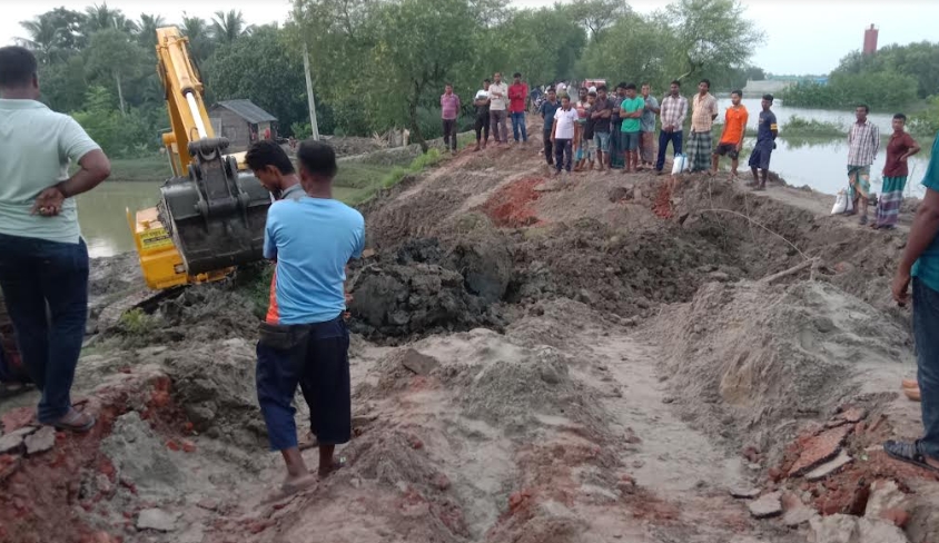 এস রফিক, ডুমুরিয়া: ডুমুরিয়ায় ঘেংরাইল-ভদ্রানদীতে অস্বাভাবিক পানি বৃদ্ধি পাওয়ায় মাদারতলা পুরাতন কালভার্টের মুখ ভেঙে ভিতরে জোয়ারে পানি ঢুকে প্লাবিত হওয়ার আশংকায় ৮ গ্রামের মানুষ আতংকিত। এ খবর দৈনিক জন্মভূমি পত্রিকায় প্রকাশিত হওয়ায় টনক নড়েছে পানি উন্নয়ন বোর্ডের। গতকাল সোমবার সকালে পানি উন্নয়ন বোর্ডের নির্বাহী প্রকৌশলী আব্দুর রহমান তাযকিয়া ও উপ -বিভাগীয় প্রকৌশলী হুমায়ুন কবির সহ একটি টিম ঘটনাস্থলে গিয়ে সড়কে পুরাতন কালভার্ট অপসারণ করে স্কেভেটর দিয়ে রাস্তা সংস্কারের কাজ শুরু করে দিয়েছেন। উল্লেখ্য,চলতি পূর্ণিমা গোনে ভরা জোয়ারে বৃষ্টির পাশাপাশি এসব নদীতে অস্বাভাবিক হারে ২/৩ ফুট উঁচুতে পানি বৃদ্ধি পায়। ফলে উপজেলার ১৭/১ পোল্ডারের আওতাধীন কাঁঠালতলা - মাগুরখালী পাকা সড়কের রারুইকাটি মঠ মন্দির থেকে খেয়াঘাট অভিমুখে প্রায় আধা কিলোমিটার সড়কের উপর দিয়ে পানি উপচে পড়ছে এবং মাদারতলা পুরাতন কালভার্টের মুখ ভেঙে পানি ভিতরে ঢুকে পড়ে বিস্তৃর্ণ এলাকা প্লাবিত হওয়ার আশংকা দেখা দেয়। আর প্লাবিত হলে বারুইকাটি,মাদারতলা,আমুড়বুনে,শেখেরট্যাক সহ ৮ গ্রামের মানুষের বসতবাড়ি,সবজি ক্ষেত ও মৎস্য ঘের তলিয়ে ব্যাপক ক্ষয়ক্ষতি হওয়ার সম্ভাবনা রয়েছে। যে কারণে চরম ঝুঁকিতে রয়েছে গ্রামবাসী। এদিকে শত শত গ্রামবাসীর রাতদিন সড়কের পাশ দিয়ে বালি ও মাটির বস্তা ফেলে এবং কালভার্টের ভাঙ্গনের মুখে বাঁশের পাইলিং ও খড় কুটো দিয়ে বন্ধ করার চেষ্টা অব্যাহত রয়েছে। কথা হয় স্থানীয় সাবেক ইউপি সদস্য নিখিল চন্দ্র মন্ডলের সাথে, তিনি জানান নদীতে পানি বৃদ্ধি পাওয়ায় এ গ্রামের পাশ দিয়ে বয়ে যাওয়া পাকা সড়কের উপর দিয়ে পানি উপচে পড়ায় বিলে সবজি, মাছের ঘের, আমন ধান, মন্দির ও বসতঘর তলিয়ে অনেক ক্ষতির সম্মুখীন হতে হবে। তাই সরকারি কোন অনুদান না পেলেও স্বেচ্ছাশ্রমে আমরা গ্রামবাসী চেষ্টা করছি। মাদারতলা গ্রামের স্বপন কুমার মিস্ত্রী সহ অনেকেই একই সুরে সুর মিলিয়ে বলেন, পুরাতন কালভার্ট মুখ ভেঙে বৃহত্তর বিলের মধ্যে পানি ঢুকার খবর পেয়ে তাৎক্ষণিক গ্রামবাসি কে সাথে নিয়ে রাতদিন স্বেচ্ছাশ্রমের মাধ্যমে ভাঙ্গন মুখে বাঁশের পাইলিং করে খড়কুটো দিয়ে পানি বন্ধ করে দেয়া হয়েছে। তা না হলে বিলে আমন ধান, মৎস্য ঘের, সবজি সহ বসতবাড়ির ব্যাপক ক্ষয়ক্ষতির সম্ভাবনা ছিল।