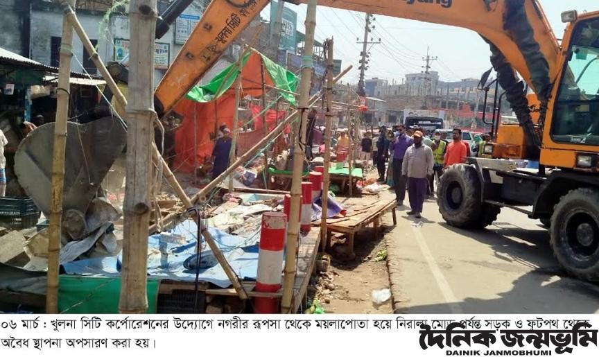 বিজ্ঞপ্তি : খুলনা সিটি কর্পোরেশনের উদ্যোগে বৃহস্পতিবার সকালে নগরীর রূপসা মোড় ও খান জাহান আলী রোড, ময়লাপোতা মোড় হয়ে নিরালা মোড় পর্যন্ত সড়ক থেকে অবৈধ দখলদারদের অপসারণ করা হয়েছে। কেসিসি’র এক্সিকিউটিভ ম্যাজিষ্ট্রেট জান্নাতুল আফরোজ স্বর্ণার নেতৃত্বে এ অপসারণ কার্যক্রম পরিচালিত হয়। অবৈধ দখল অপসারণকালে রূপসা মোড়ে ফুটপথ দখল করে মাংস বিক্রয়ের অপরাধে মোহাম্মদ মোস্তফা’কে ১ হাজার টাকা এবং ময়লাপোতা মোড়ের ফল বিক্রেতা মো: সোহাগ’কে ৫ হাজার টাকা জরিমানা করে তাৎক্ষণিক আদায় করা হয়। এছাড়া অভিযানকালে সড়ক ও সড়কের ফুটপথ থেকে অবৈধ স্থাপনা অপসারণ করা হয়। কেসিসি’র এস্টেট অফিসার গাজী সালাউদ্দিনসহ কেএমপি’র পুলিশ সদস্যগণ অপসারণ কার্যক্রমে অংশগ্রহণ করেন। জনস্বার্থে এ অপসারণ কার্যক্রম অব্যাহত থাকবে।