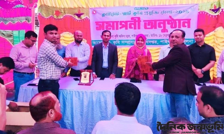 পাইকগাছা অফিস : পাইকগাছায় ক্লাইমেট-স্মার্ট কৃষি প্রযুক্তি মেলা-২০২৫ এর সমাপনী ও পুরস্কার বিতরণী অনুষ্ঠান উপজেলা কৃষি সম্প্রসারণ অধিদপ্তরের আয়োজনে অনুষ্ঠিত হয়েছে। বুধবার দুপুরে উপজেলা কৃষি অফিস চত্বরে কৃষি কর্মকর্তা কৃষিবিদ মো. একরামুল হোসেনের সভাপতিত্বে সমাপনী ও পুরস্কার বিতরণী অনুষ্ঠানে প্রধান অতিথি ছিলেন উপজেলা নির্বাহী অফিসার মাহেরা নাজনীন। বিশেষ অতিথি ছিলেন, উপজেলা সহকারী কমিশনার (ভূমি) মো. ইফতেখারুল ইসলাম শামীম, সিনিয়র উপজেলা মৎস্য কর্মকর্তা সৈকত মল্লিক, প্রকৌশলী মো. শাফিন শোয়েব, উপাধ্যক্ষ মিহির বরণ মন্ডল, ইউআরসি ইন্সট্রাক্টর মো. ঈমান উদ্দিন, পল্লী সঞ্চয় ব্যাংকের ব্যবস্থাপক জয়ন্ত কুমার ঘোষ, খাদ্য নিয়ন্ত্রক মো. হাসিবুর রহমান, এসএফডিএফ কর্মকর্তা জিএম জাকারিয়া, বিআরডিবি সঞ্জয় কুমার মন্ডল, কৃষি সম্প্রসারণ কর্মকর্তা এস এম মনিরুল হুদা, উপ-সহকারী উদ্ভিদ সংরক্ষণ অফিসার বিশ্বজিত দাশ, উপ-সহকারী কৃষি কর্মকর্তা উত্তম কুন্ডু , মো. আবুল কালাম আজাদ, শেখ তোফায়েল আহমেদ তুহিন, দেবদাস রায়, মো. এনামুল হক, তাপস সরকার, মৃণাল দাশ, সুব্রত দত্ত, মো. শামীম আফজাল, মো. ইমরান হোসেন, মো. ফয়সাল আহমেদ, মো. আতাউল্লাহ সহ কৃষি দপ্তরের উপ-সহকারী,ষ ও উপকারভোগীরা উপস্থিত ছিলেন।স্মার্ট কৃষি প্রযুক্তি মেলায় পুরস্কার বিতরণীতে কৃষি প্লান্ট প্রদর্শনিতে বিভিন্ন ক্যাটাগরিতে ১৮ জন কৃষক-কৃষাণি, স্টল পরিদর্শনীতে ৩ টা এবং বিশেষ ক্যাটাগরিতে ২টা স্টলকে পুরস্কার প্রদান করা হয়।