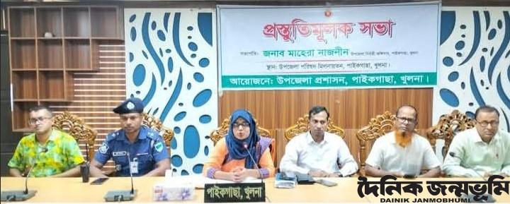 পাইকগাছা প্রতিনিধি : উৎসব মুখর পরিবেশে নববর্ষ উদযাপন উপলক্ষে পাইকগাছা উপজেলা প্রশাসনের প্রস্তুতি মূলক সভা অনুষ্ঠিত হয়েছে। বৃহস্পতিবার সকালে উপজেলা পরিষদ মিলনায়তনে উপজেলা প্রশাসন কর্তৃক আয়োজিত সভায় সভাপতিত্ব করেন, উপজেলা নির্বাহী অফিসার মাহেরা নাজনীন। সভায় বিশেষ অতিথি ছিলেন উপজেলা সহকারী কমিশনার ভূমি মো. ইফতেখারুল ইসলাম শামীম, উপজেলা সিনিয়র মৎস্য কর্মকর্তা সৈকত মল্লিক, উপাধ্যক্ষ মিহির বরন মন্ডল, মাধ্যমিক শিক্ষা অফিসার শাহজাহান আলী শেখ। এসময়ে অন্যান্যদের মধ্যে উপস্থিত ছিলেন, শিক্ষা অফিসার বিদ্যুৎ রঞ্জন শাহা, প্রানি সম্পদ কর্মকর্তা পার্থ প্রতিম রায়, উপজেলা হিসাব রক্ষন অফিসার আবুল বাশার, মুক্তিযোদ্ধা রনজিৎ কুমার রায়, ভারপ্রাপ্ত অধ্যক্ষ উৎপল কুমার বাইন, সহকারী প্রোগ্রামার মৃদুল কান্তি দাস, পল্লী সঞ্চয় ব্যাংক কর্মকর্তা জয়ন্ত কুমার ঘোষ, সহকারী কৃষি অফিসার এসএম মনিরুল হুদা, প্রধান শিক্ষিকা সেলিনা পারভীন,ভারপ্রাপ্ত চেয়ারম্যান জাহাঙ্গীর আলম সানা, খোরশেদুজ্জামান, জনস্বাস্থ্য সহকারী প্রকৌশলী প্রশান্ত পাল, সচিব ফারুক হোসেন সরদার, শেখ মিরাজুল ইসলামসহ বিভিন্ন দপ্তরের কর্মকর্তাগণ।