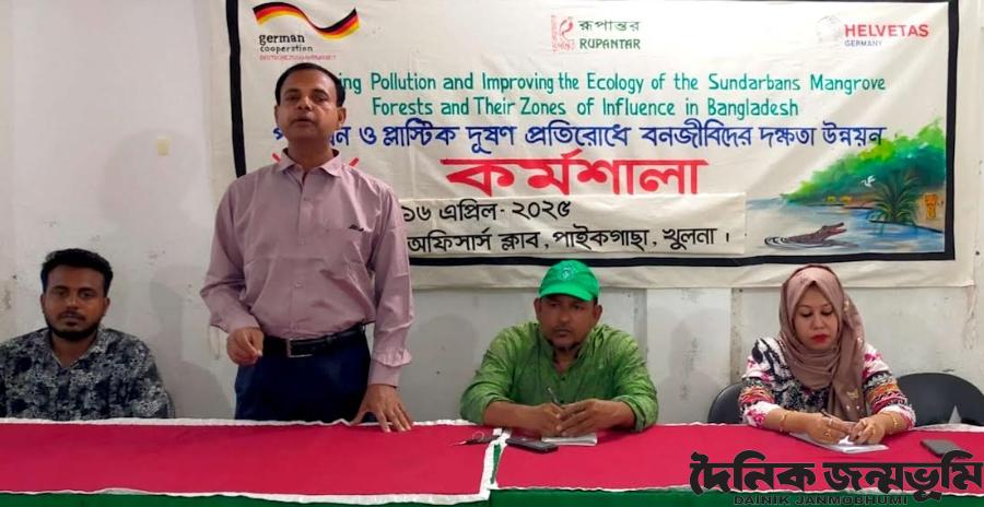পাইকগাছা প্রতিনিধি : পাইকগাছায় পলিথিন ও প্লাস্টিক দূষণ প্রতিরোধে বনজীবীদের দক্ষতা উন্নয়ন বিষয়ক কর্মশালা অনুষ্ঠিত হয়েছে। বুধবার সকালে অফিসার্স ক্লাবে বেসরকারি উন্নয়ন সংস্থা রুপান্তর এ কর্মশালার আয়োজনে অব. উপজেলা বন কর্মকর্তা প্রেমানন্দ রায় এর সভাপতিত্বে অনুষ্ঠিত হয়। কর্মশালায় প্রকল্পের কার্যক্রম উপস্থাপন করেন রুপান্তর প্রতিনিধি সাকী রেজওয়ানা। বক্তৃতা করেন, প্রেসক্লাবের সহ সভাপতি মো. আব্দুল আজিজ, সাংবাদিক মাজহারুল ইসলাম মিথুন, ইয়ুথ যুব ক্লাবের রাকিবুল ইসলাম, কৃষ্ণা চক্রবর্তী, আলিফা খাতুন, ছন্দা সুলতানা, ভোলা বিশ্বাস, শিউলি, মেরিনা, বাসনা, মনি সানা, সুশান্ত, মাসুদ রানা বাবু, আব্দুর রাজ্জাক, দেলোয়ার, শাহ আলম, শহিদুল ইসলাম, মাসুম, মিরাজুল ইসলাম, ইবাদুল ইসলাম ও মনিরুল ইসলাম। কর্মশালায় সুন্দরবন ও সুন্দরবন সংলগ্ন এলাকার নদ নদীর পরিবেশ সংরক্ষণে পলিথিন ও প্লাস্টিকের ব্যবহার কমিয়ে আনা এবং বিকল্প পরিবেশ বান্ধব ব্যবস্থা গ্রহণ এবং বিষ দিয়ে মাছ না ধরার জন্য গুরুত্বারোপ করা হয়।