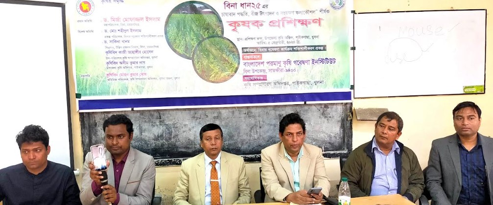 পাইকগাছা অফিস : পাইকগাছায় উচ্চ ফলনশীল ও প্রিমিয়াম কোয়ালিটি সম্পন্ন বোরো ধানের যাত বিনা ধান ২৫ এর চাষাবাদ পদ্ধতি, বীজ উৎপাদ ও সংরক্ষণ কলাকৌশল শীর্ষক কৃষক প্রশিক্ষণ অনুষ্ঠিত হয়েছে। বিনা’র গবেষণা কার্যক্রম শক্তিশালী করণ প্রকল্পের আওতায় কৃষি সম্প্রসারণ অধিদপ্তর পাইকগাছা এর সহযোগীতায় সোমবার সকালে উপজেলা কৃষি অফিসের কৃষক প্রশিক্ষণ মিলনায়তনে বাংলাদেশ পরমাণু কৃষি গবেষণা ইনস্টিটিউট সাতক্ষীরার বিনেরপোতা উপকেন্দ্র এ প্রশিক্ষণ এর আয়োজন করে। কৃষি সম্প্রসারণ অধিদপ্তর খুলনা অঞ্চলের অতিরিক্ত পরিচালক কৃষিবিদ মোহন কুমার ঘোষের সভাপতিত্বে প্রশিক্ষণে ভার্চুয়ালী প্রধান অতিথি ছিলেন বাংলাদেশ পরমাণু কৃষি গবেষণা ইনস্টিটিউট এর মহা-পরিচালক ড. মির্জা মোফাজ্জল ইসলাম। বিশেষ অতিথি ছিলেন বিনা’র গবেষণা শক্তিশালী করণ প্রকল্পের প্রকল্প পরিচালক ড. মো. শহিদুল ইসলাম, খুলনা বিশ্ববিদ্যালয়ের এগ্রো টেকনোলজি বিভাগের প্রফেসর ড. মো. সরওয়ার জাহান, বিনা’র উদ্ভিদ প্রজনন বিভাগের মুখ্য বৈজ্ঞানিক কর্মকর্তা ড. সাকিনা খানম, কৃষি সম্প্রসারণ অধিদপ্তর খুলনা’র উপ-পরিচালক কৃষিবিদ কাজী জাহাঙ্গীর হোসেন ও উপজেলা কৃষি অফিসার কৃষিবিদ অসীম কুমার দাস।
