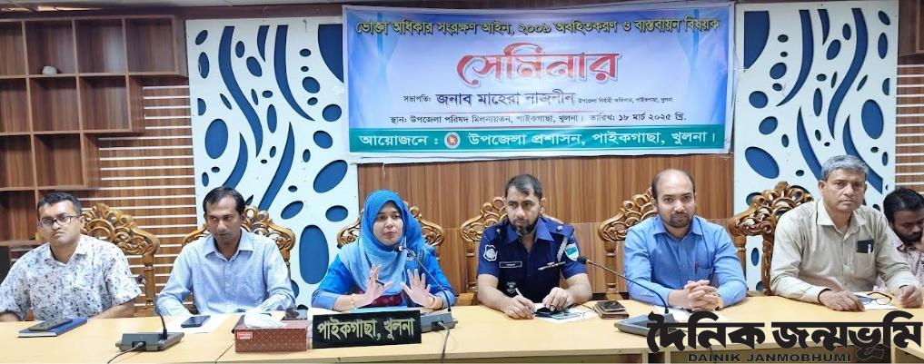 পাইকগাছা অফিস : পাইকগাছায় উপজেলা প্রশাসনের উদ্যোগে ভোক্তা অধিকার সংরক্ষণ আইন -২০০৯ অবহিতকরণ ও বাস্তবায়ন সভা অনুষ্ঠিত হয়েছে। মঙ্গলবার সকালে উপজেলা পরিষদ মিলনায়তনে উপজেলা নির্বাহী অফিসার মাহেরা নাজনীন'র সভাপতিত্বে এ সভা অনুষ্ঠিত হয়। সভায় সহকারী কমিশনার ভূমি মো. ইফতেখারুল ইসলাম শামীম, ওসি মো. সবজেল হোসেন, পল্লী বিদ্যুৎ সমিতির ডিজিএম সঞ্জয় রায়, সাবেক মুক্তিযোদ্ধা কমান্ডার রুহুল আমিন গাজী, সিনিয়র উপজেলা মৎস্য কর্মকর্তা সৈকত মল্লিক, প্রাণী সম্পদ কর্মকর্তা ডা. পার্থ প্রতিম রায়, কৃষি অফিসার একরামুল হোসেন, উপজেলা প্রকৌশলী মো. শাফিন শোয়েব, শিক্ষা অফিসার বিদ্যুৎ রঞ্জন সাহা, সমাজসেবা কর্মকর্তা অনাথ কুমার বিশ্বাস, যুব উন্নয়ন কর্মকর্তা এসএম কামরুজ্জামান, মহিলা বিষয়ক কর্মকর্তা রেশমা আক্তার, ইউআরসি ইন্সট্রাক্টর মো. ঈমান উদ্দিন, পল্লী উন্নয়ন কর্মকর্তা ওয়াহিদ মুরাদ, আনসার ও ভিডিপি কর্মকর্তা মৌলুদা খাতুন, তথ্য কর্মকর্তা তন্বী দাশ, বন কর্মকর্তা প্রবীর কুমার দত্ত, পিআইও রাজিব বিশ্বাস,