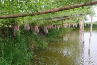 সাতক্ষীরা প্রতিনিধি : পুকুরে চাষ করা হয়েছে মাছ। ওপরে মাচায় ঝুলছে তরমুজ। সাতক্ষীরার পাটকেলঘাটার একটি ঘের থেকে তোলা। ছবি: আজকের পত্রিকা