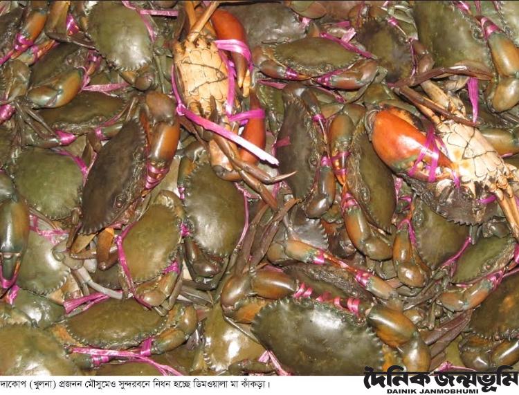 এলাকাবাসী সূত্রে জানা গেছে, জানুয়ারী ও ফেব্রুয়ারী মাস মা কাঁকড়ার প্রধান প্রজনন মৌসুম। এসময়ে প্রাকৃতিক এই মৎস্য সম্পদের প্রজনন বৃদ্ধির লক্ষে সরকারী ভাবে সুন্দরবনে কাঁকড়া ধরার পাশ পারমিট বন্ধ রাখার রয়েছে নির্দেশনা। এই দুই মাসে মেদী-মায়া কাঁকড়া কোটি কোটি বাচ্চা ছাড়ে। আর বনের উপকূলীয় এলাকার হাজারো জেলে এই কাঁকড়া ধরে জীবিকা নির্বাহ করে থাকেন। এ ছাড়া এই কাঁকড়া বিদেশে রপ্তানি করে ব্যবসায়ীরাও বছরে কোটি টাকা আয় করেন। কিন্তু সুন্দরবন পূর্ব ও পশ্চিম বনবিভাগের বিভিন্ন স্টেশনধীন নদী ও খালে অবাধে ডিমওয়ালা মা কাঁকড়া নিধন চালিয়ে আসছেন। কোন প্রকার নিয়মনীতির তোয়াক্কা করছেন না অসাধু জেলেরা। আর আর্থিক চুক্তিতে বনবিভাগের কতিপয় দূর্নীতিবাজ কর্মকর্তারা এসব অসাধু জেলেদের সহযোগিতা করে আসছেন। আগে কাঁকড়ার দাম কিছুটা কম থাকলেও বর্তমানে ঢাকাসহ বড় মোকামে ব্যাপক বৃদ্ধি পেয়েছে। সর্ব নিন্মে ২৫০ থেকে সর্বোচ্চ ২২০০ টাকা কেজি দরে কাঁকড়া বিক্রি হচ্ছে বলে বিভিন্ন ব্যবসায়ীর সাথে আলাপ করে জানা গেছে। অধিক লাভের আশায় স্বার্থনেষী এসব শত শত জেলে মাছ ধরার পাশ পারমিট নিয়ে প্রতিদিন হাজার হাজার মন মা কাঁকড়া আহরন করে প্রজনন বৃদ্ধিতে ব্যাপক ক্ষতি সাধন করে চলেছেন। আবার প্রকাশ্যে আই ওয়াশ দিয়ে সুন্দরবন সংলগ্ন দাকোপ, মোংলা, শরণ খোলা, পাইকগাছা, কয়রা, শ্যামনগর উপজেলার বিভিন্ন বাজারের ডিপোতে এসব কাঁকড়া হ্যাচারীর বলে বিক্রি করছেন জেলেরা। ব্যবসায়িরাও এসব উপজেলার পুলিশ প্রশাসন ম্যাসেজ করে দেদারচ্ছে ব্যবসা চালিয়ে যাচ্ছেন। মাঝে মধ্যে লোক দেখানো এসব কাঁকড়ার দুই একটি চালান ধরা পড়লেও কিছুতেই বন্দ হচ্ছে না মা কাঁকড়া নিধন।