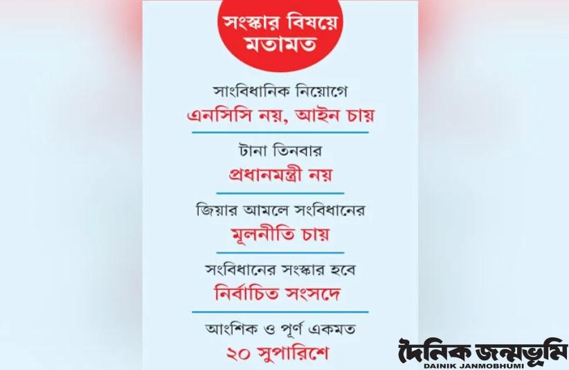 সংবিধান সংস্কারের ৭০টি সুপারিশের মধ্যে ১১টিতে একমত ও তিনটিতে নীতিগতভাবে ঐকমত্য প্রকাশ করেছে তারা। ছয়টি সুপারিশের সঙ্গে আংশিক একমত হয়েছে দলটি। বিএনপি যে ২০ প্রস্তাবের সঙ্গে আংশিক বা পুরো একমত, সেগুলো তারা আগামী সংসদে বাস্তবায়ন চায়।